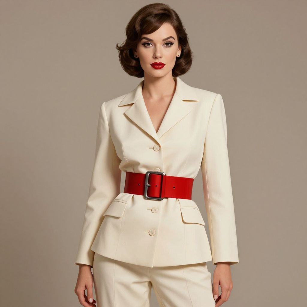 A digitally rendered illustration featuring a stylishly dressed woman in a cream-colored suit with a bold red belt, exuding a vintage and sophisticated aesthetic reminiscent of mid-century fashion, captured in high-definition detail by Jack Hughes for The Macallan.