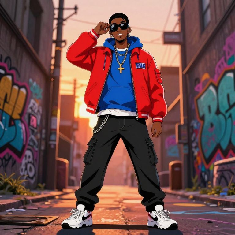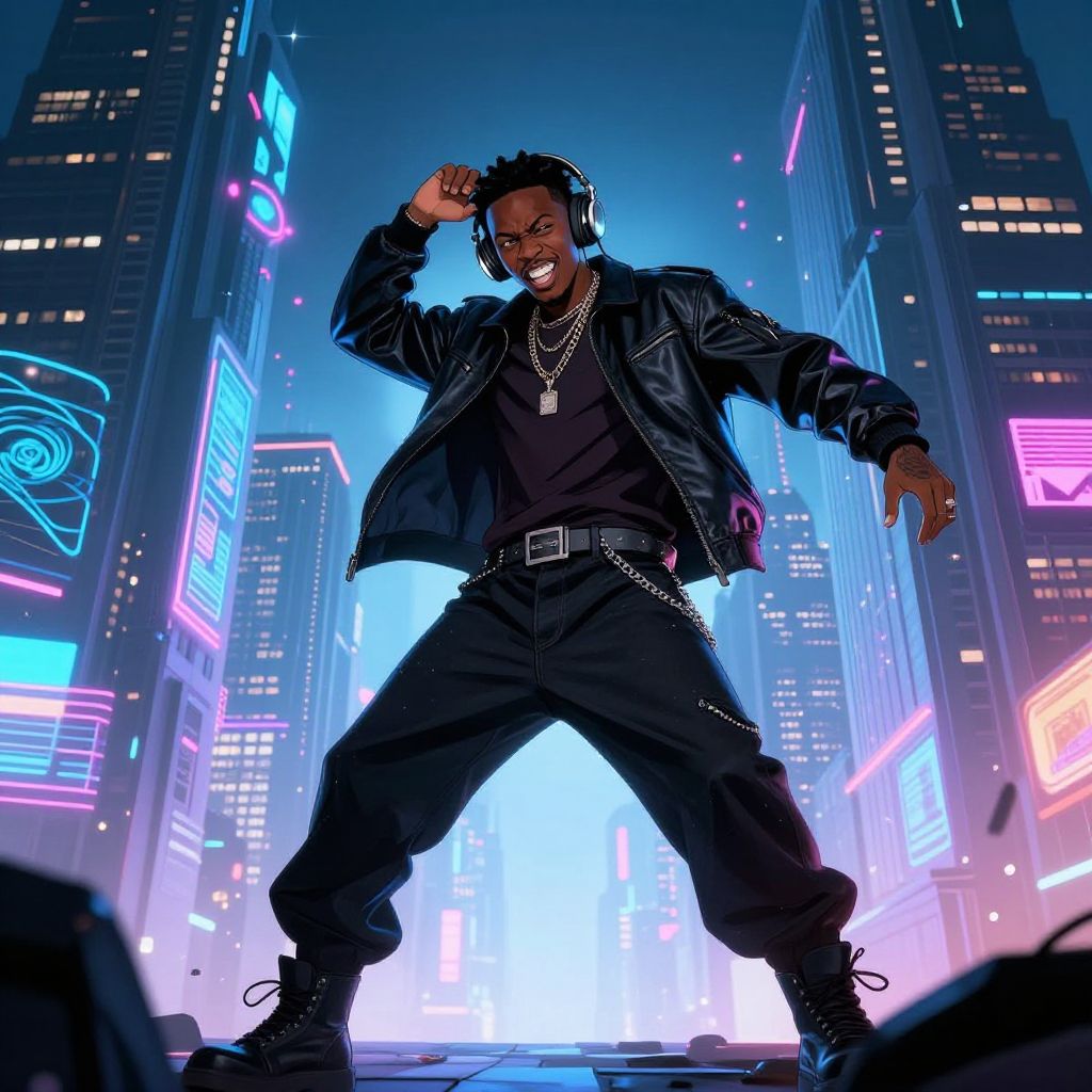 Akira kanye west dystopian metropolis, towering skyscrapers, glowing holograms, anime character in stylish attire with headphones, energetic and rebellious mood