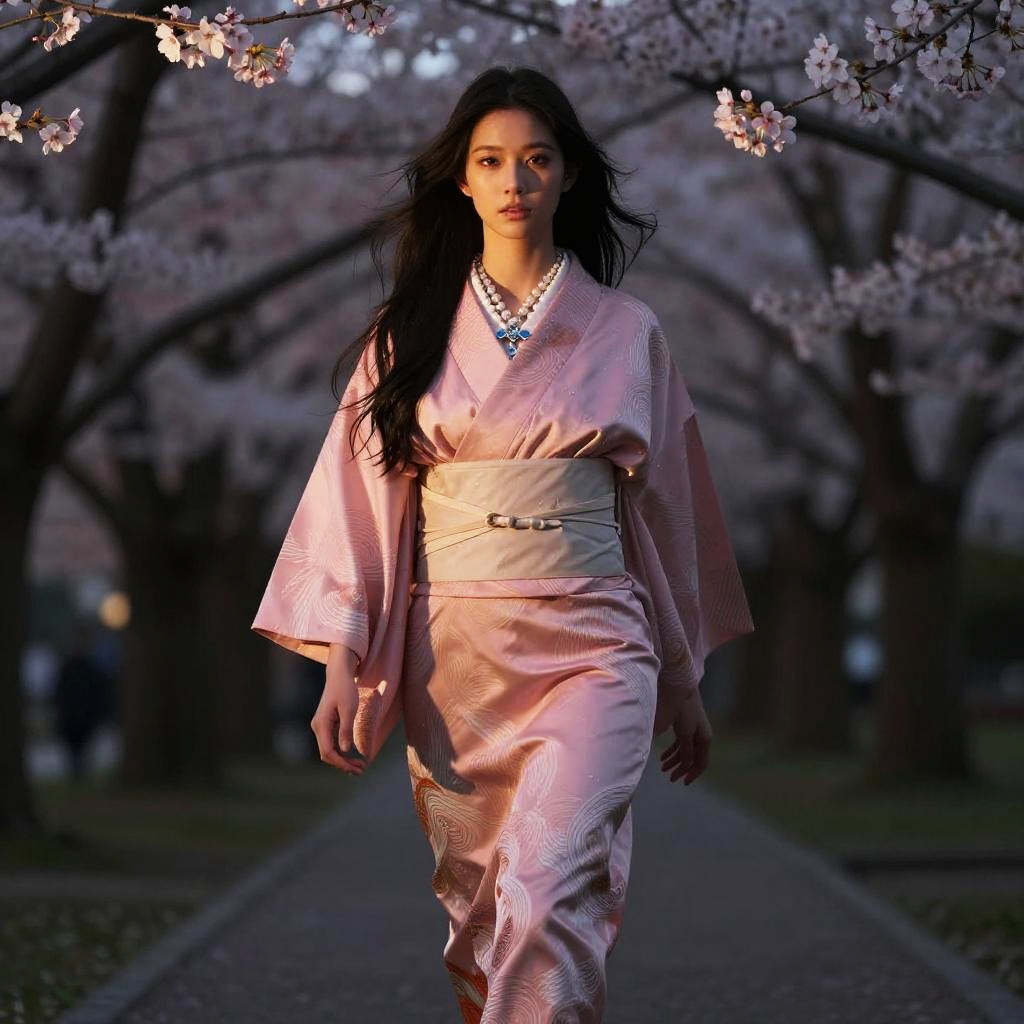 (realistic), (masterpiece:1.2), (best quality:1.2), looking at viewer, dramatic pose, (walking in sakura garden:1.2), golden hour, dim light, rim light, (sakura:1.2), 1girl, (pink sabai), (jewelry:1.2), long hair, (linekanok pattern:1.25)