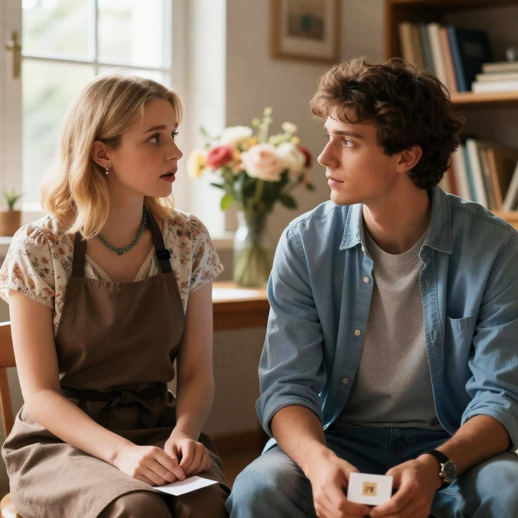 Photograph of a woman and a man sitting on a carousel swing. Woman with blonde hair, black sleeveless top, and dog tag necklace, looking at the man. Man with dark hair, green button-up shirt, arms crossed, serious expression. Background shows trees and sunset. Swing with metal frame and red seat. Carousel lights visible in the distance.