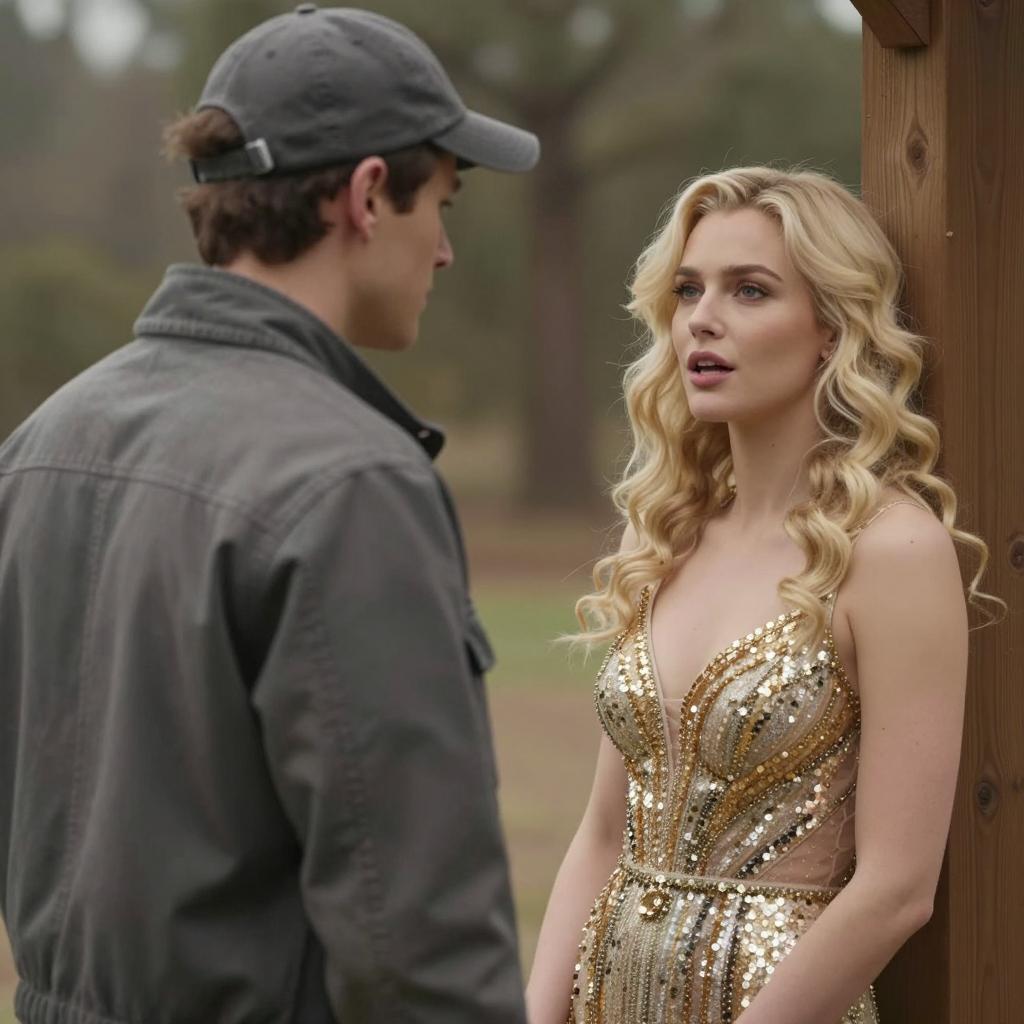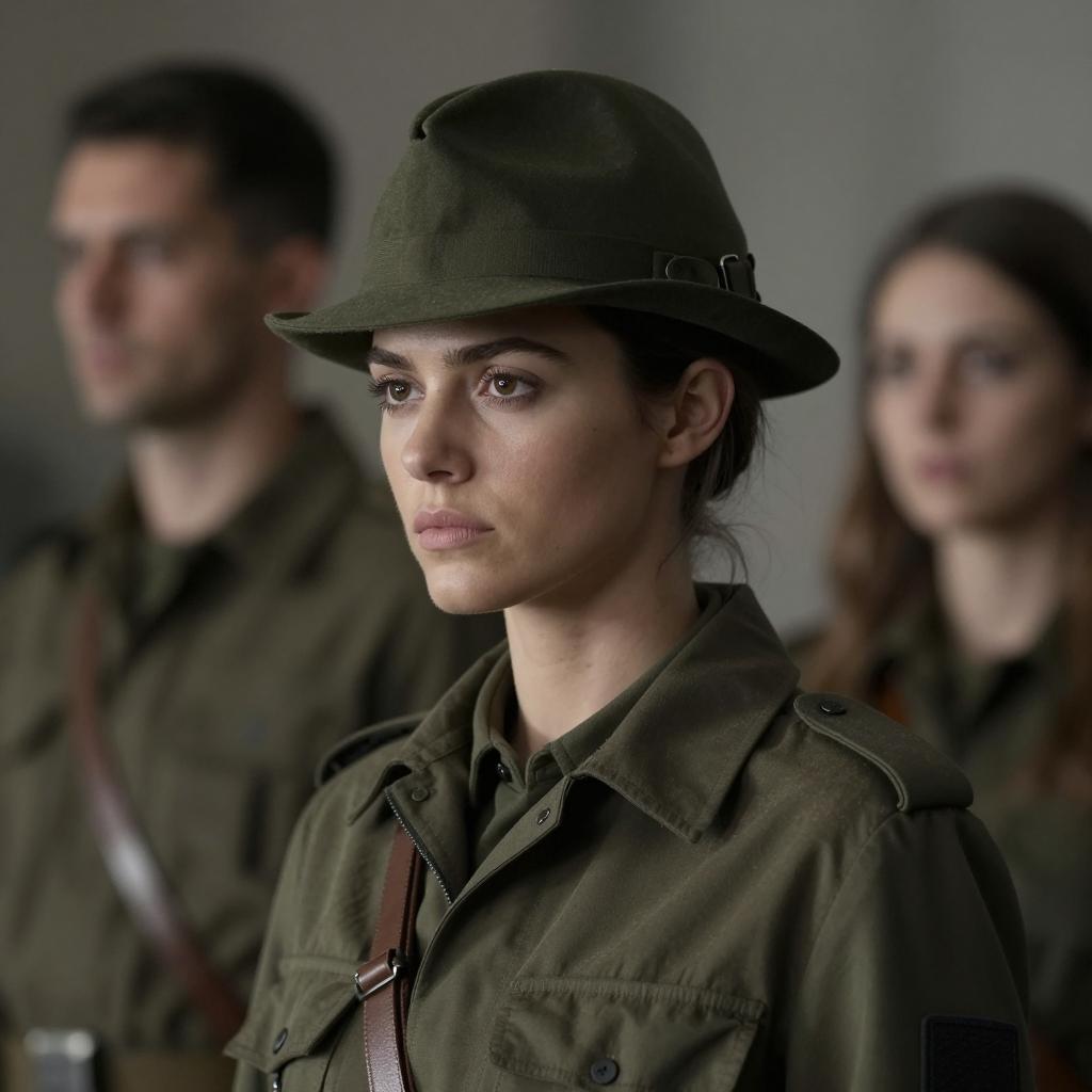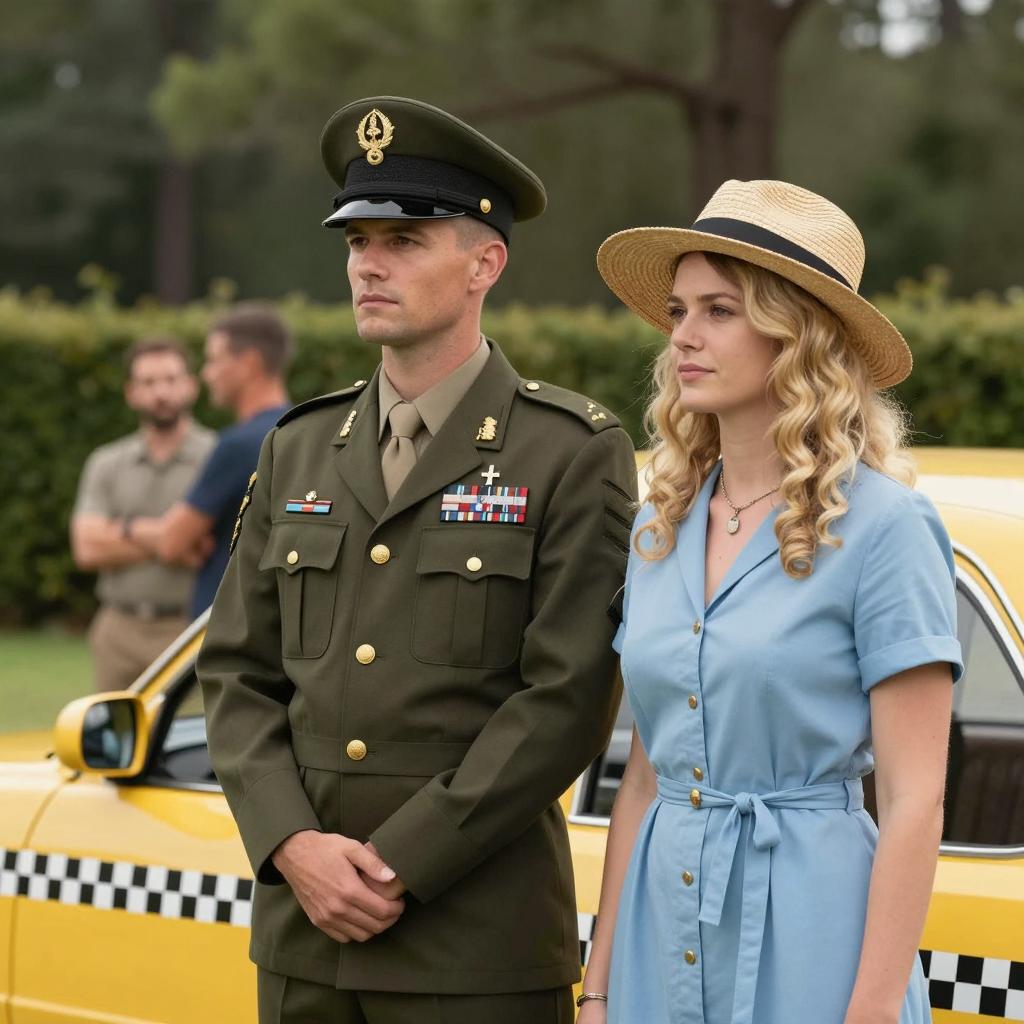 Military man in olive green uniform with medals, black peaked cap, and khaki tie stands beside a blonde woman with curly hair wearing a light blue dress and straw hat. Yellow car with checkered trim in the background. Both look to the right. Forest and hedges in the background. Two people.