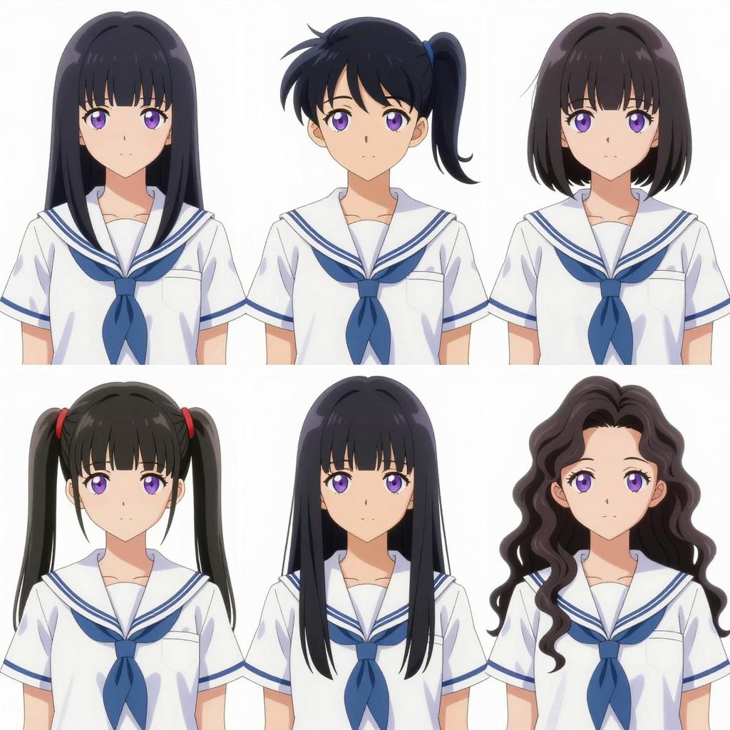 Illustration of an East Asian woman with black hair and straight bangs, wearing a purple and white sailor school uniform. She has large pink eyes, red lips, and light skin. Her right hand, with purple nail polish, is near her chest. She stands against a pink gradient background with a green diamond-patterned fence on the left. Her expression is neutral, with slightly parted lips.