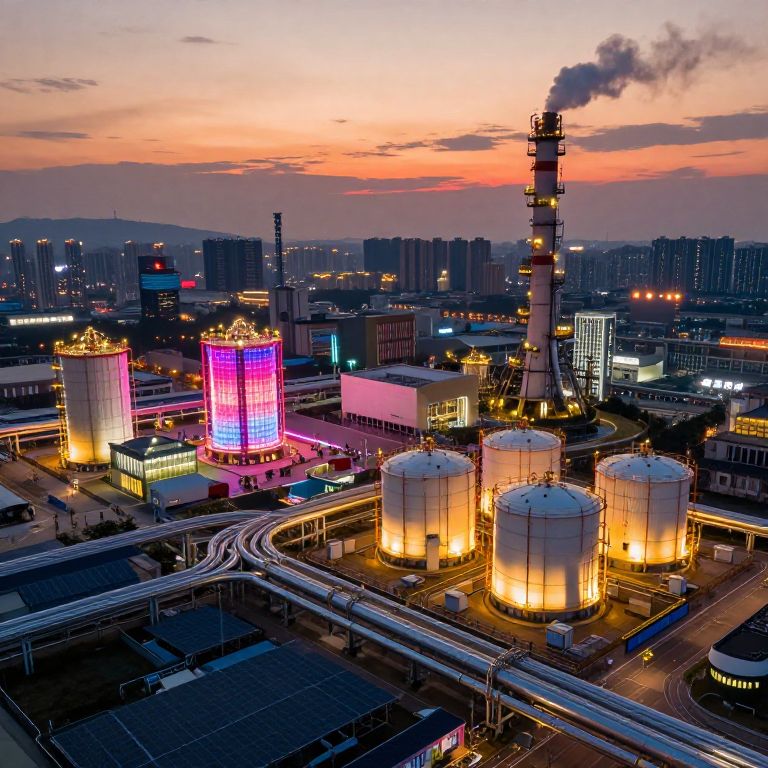 Fuels powering a futuristic cityscape at sunset, intricate pipelines and glowing tanks, vibrant neon colors, bustling energy hubs, a mix of traditional and renewable energy sources, high detail, dynamic lighting, cinematic atmosphere.