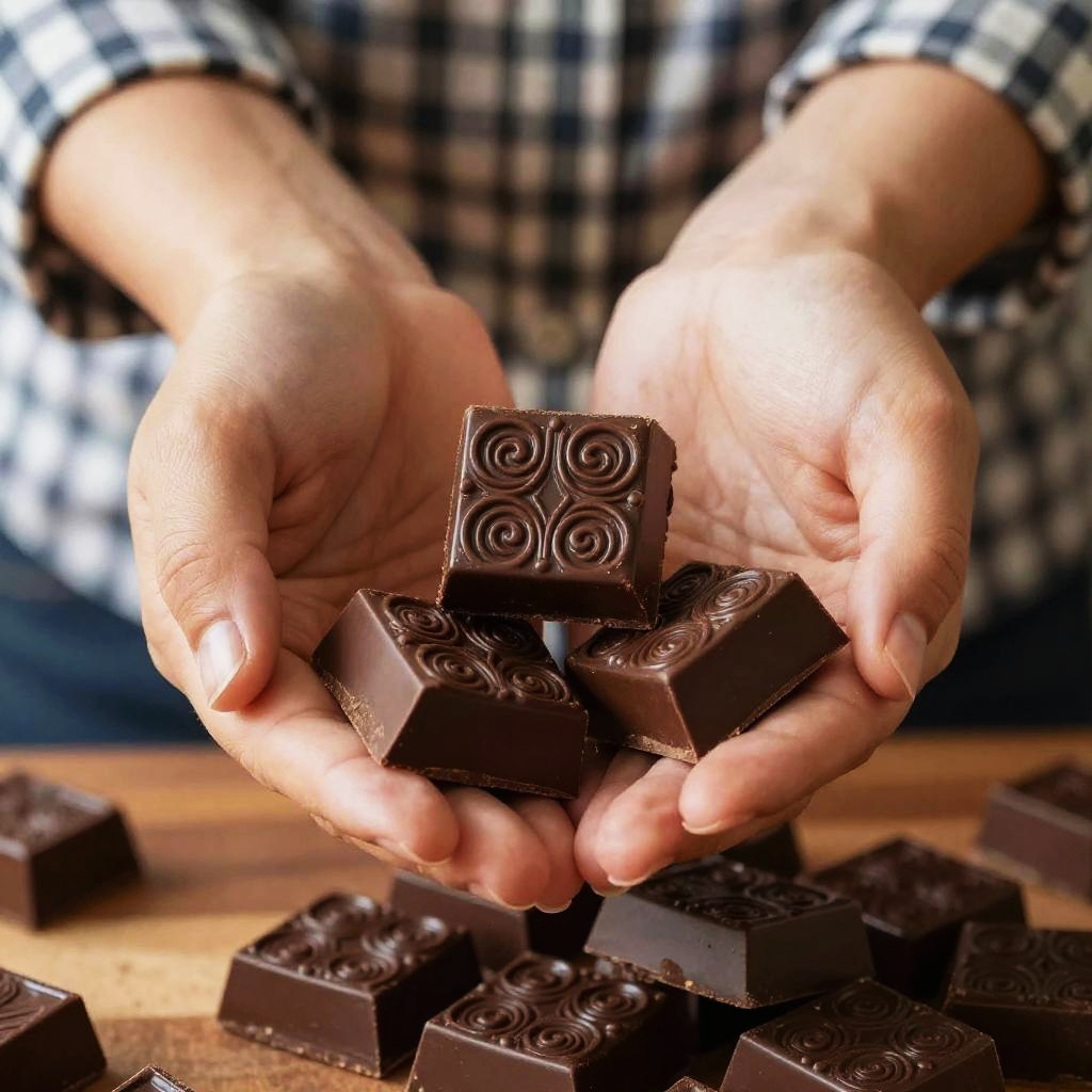 This close-up photo shows a rough, dark wooden surface with scattered pieces of broken, light brown ceramic tiles. Some tiles have faint, etched designs. A black pencil lies diagonally across the top left. The tiles and pencil are partially covered in dust and small debris, adding a sense of disarray. The lighting is natural, casting soft shadows.