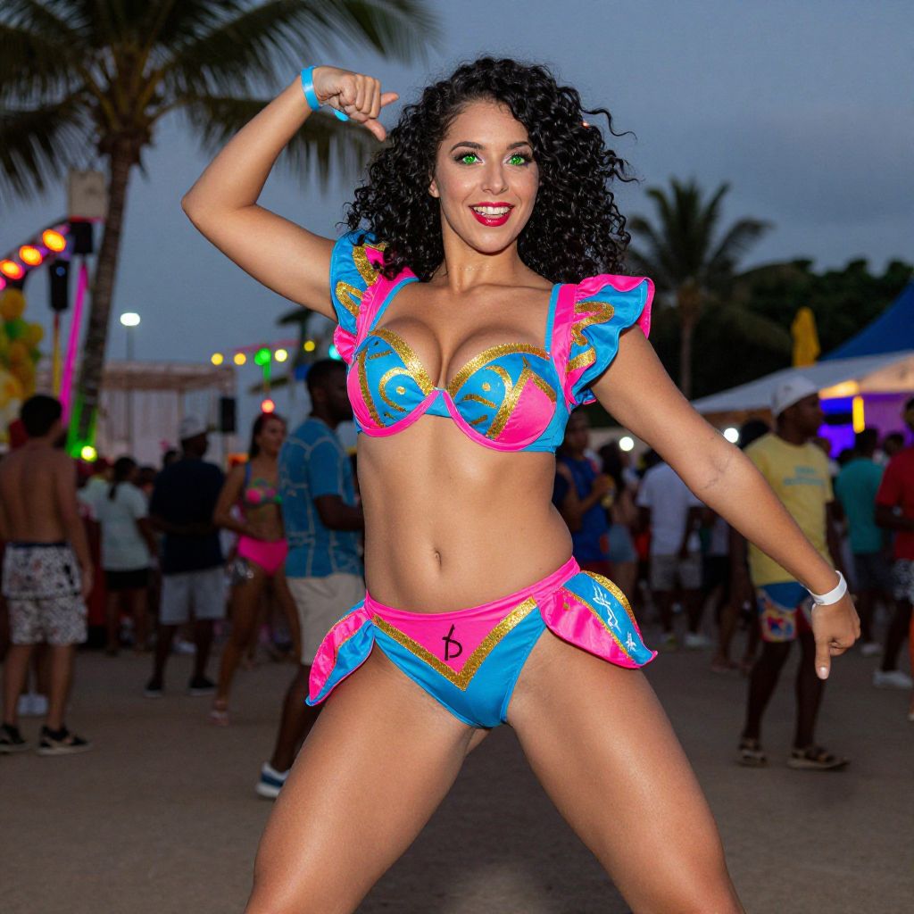 A dynamic, colorful dance costume made of electric blue, hot pink, and gold fabrics with hand-painted details, worn by a tall, athletic woman with curly black hair, a confident smile, and bright green eyes, dancing in a tropical festival environment with palm trees and colorful lights at dusk.. The woman has big breasts and cute face