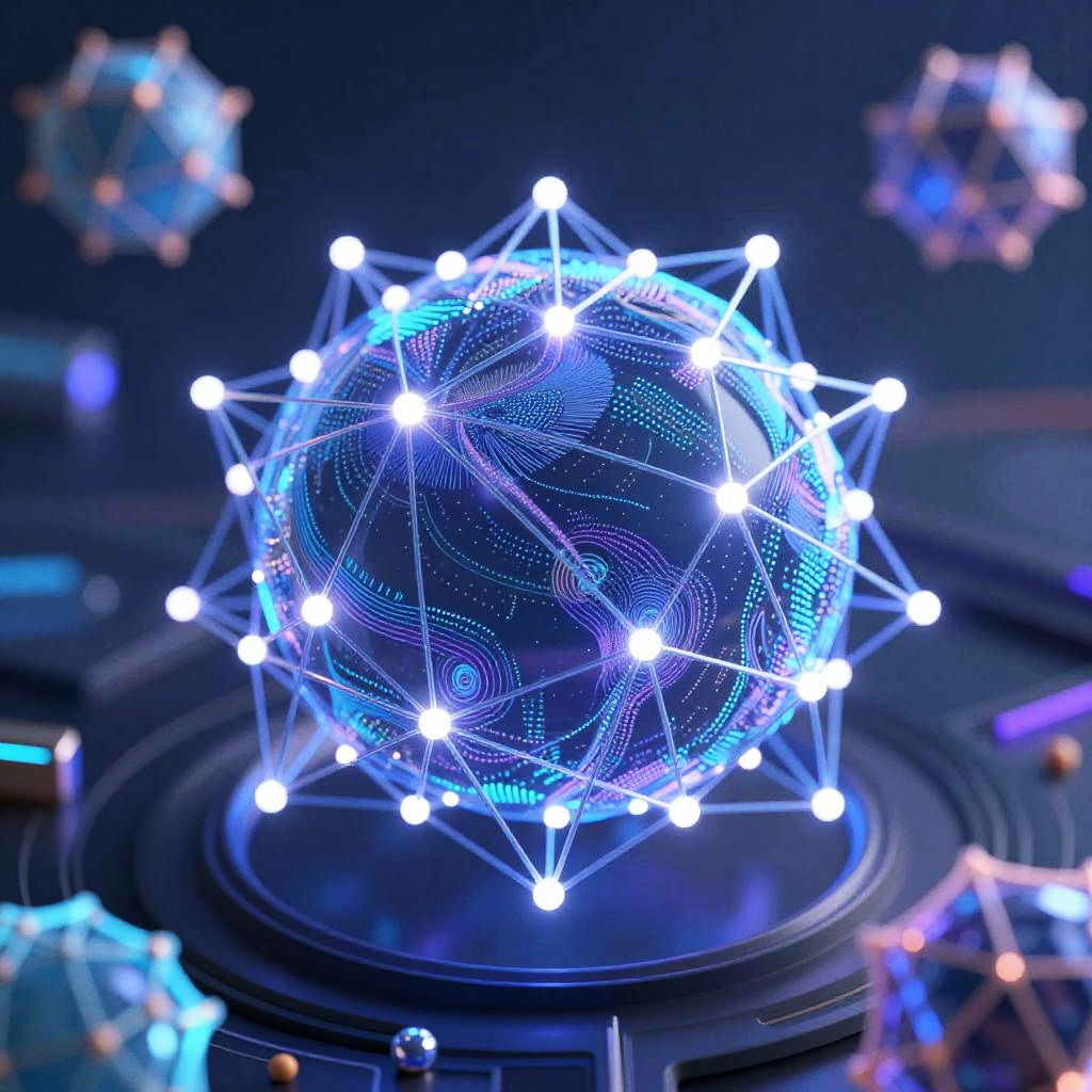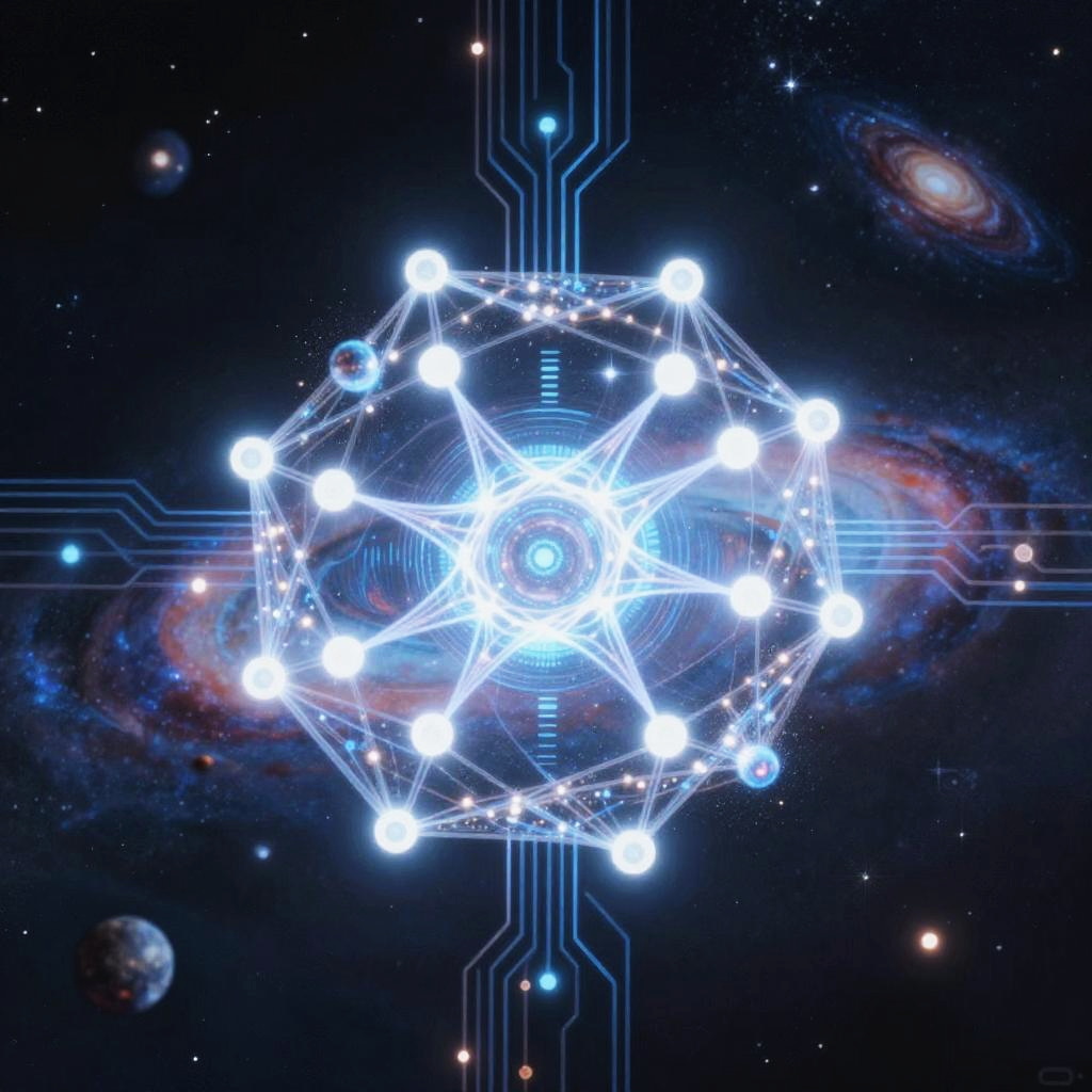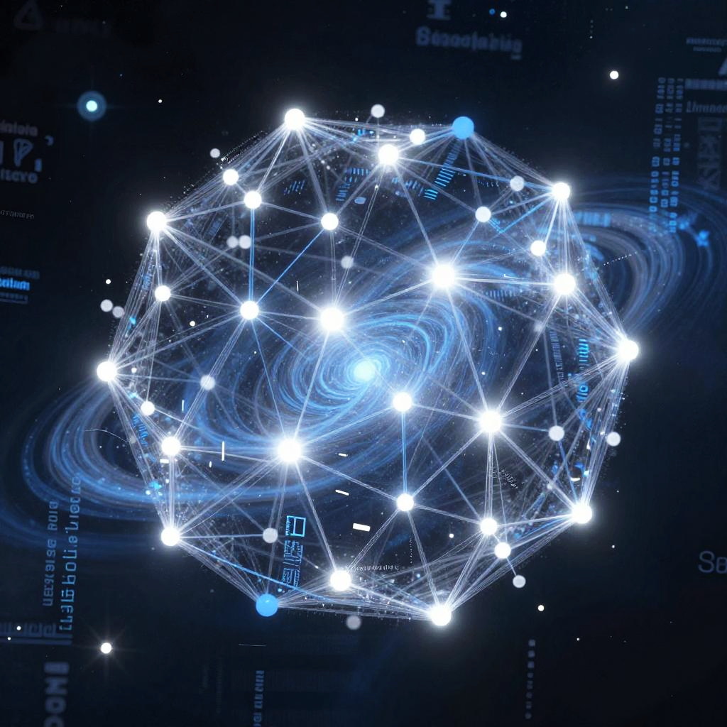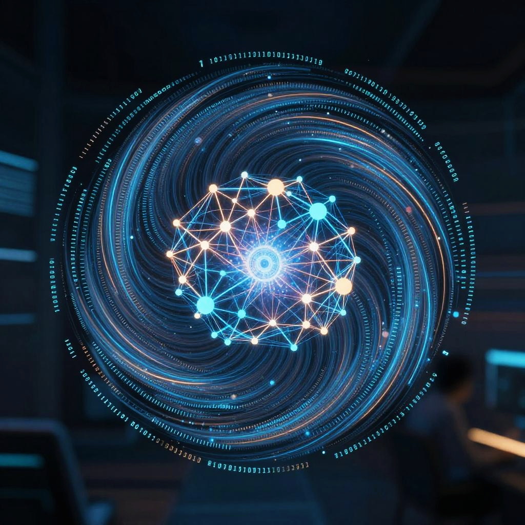 A sleek AI story finisher visualized as an abstract neural network with flowing light pathways, weaving together fragmented story elements into a coherent narrative, set against a backdrop of a starry digital universe filled with words and symbols.