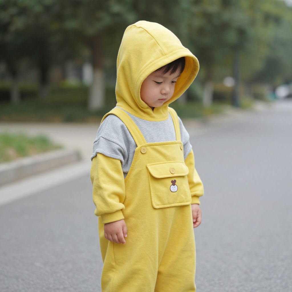 A child is wearing a yellow outfit with a hood and a gray shirt. The child is standing on a street with trees in the background.