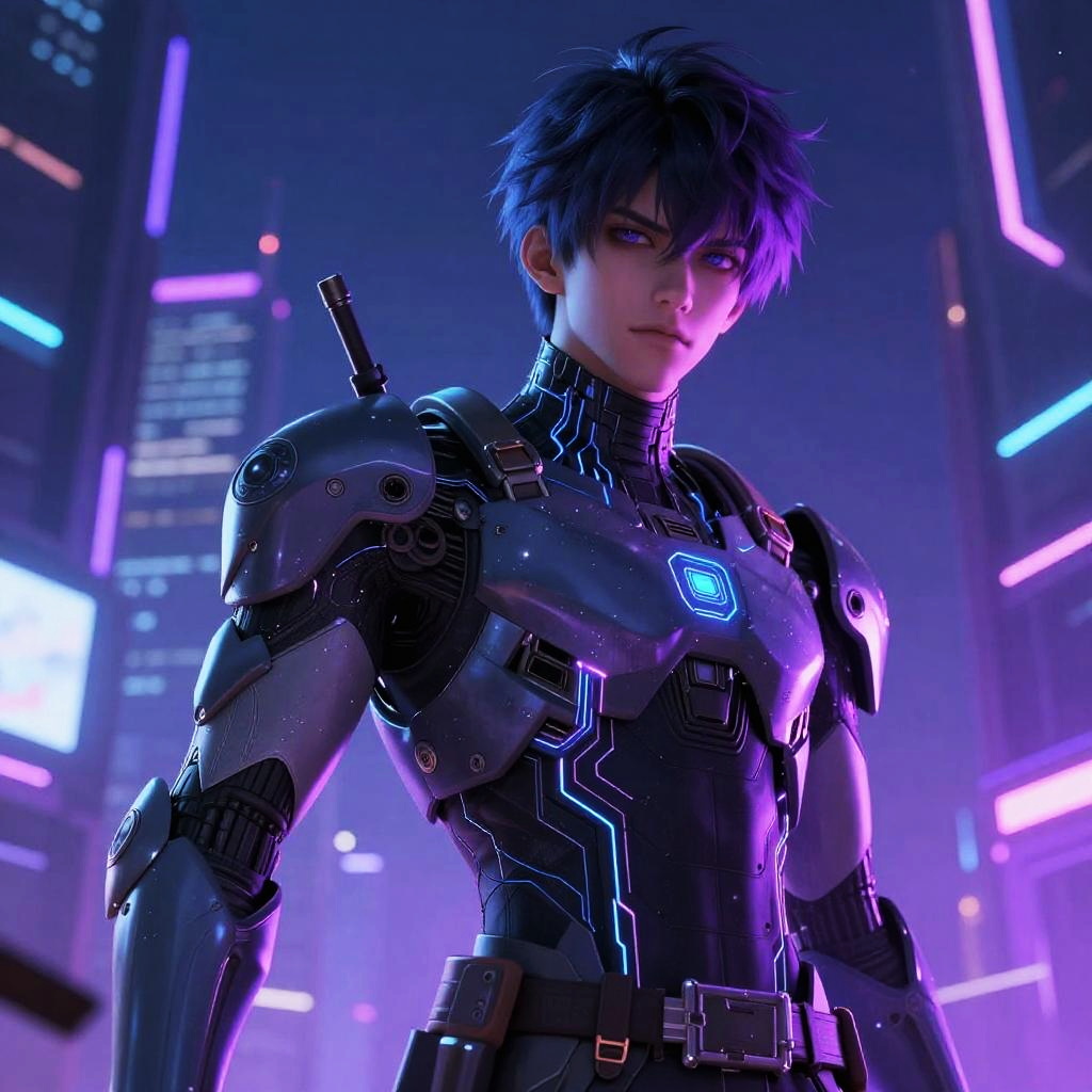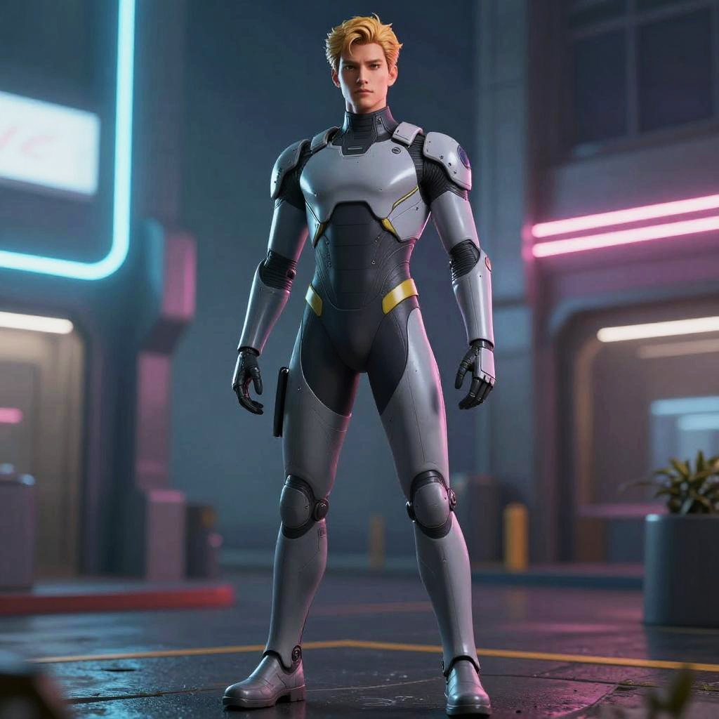 AI person generator full-body, hyper-realistic humanoid figure standing confidently, sleek futuristic attire with dynamic lighting, detailed skin texture, modern urban background with neon accents, cinematic composition, photorealistic rendering.