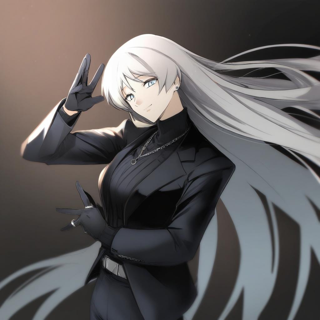 Digital artwork of an anime-style woman with blue eyes and very long white hair, wearing a black turtleneck ribbed sweater, black jacket, black gloves, and black pants. She accessorizes with a ring necklace, rings on her fingers, and small earrings. The character strikes a confident pose against a dark gradient background.
