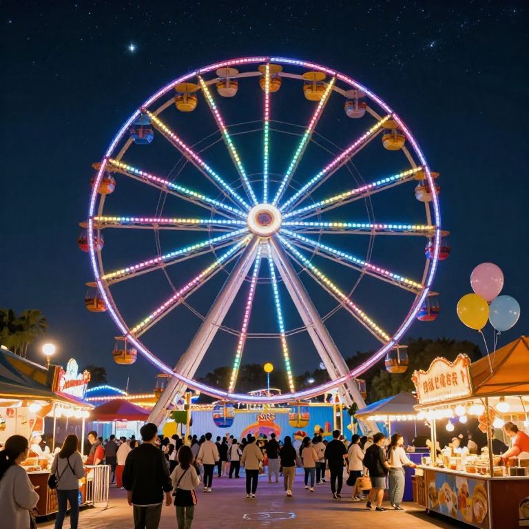 A giant megawheel illuminated with colorful LED lights spinning slowly against a starry night sky, surrounded by a lively amusement park filled with joyful families, food stalls emitting warm light, and balloons floating gently, highly detailed, festive mood