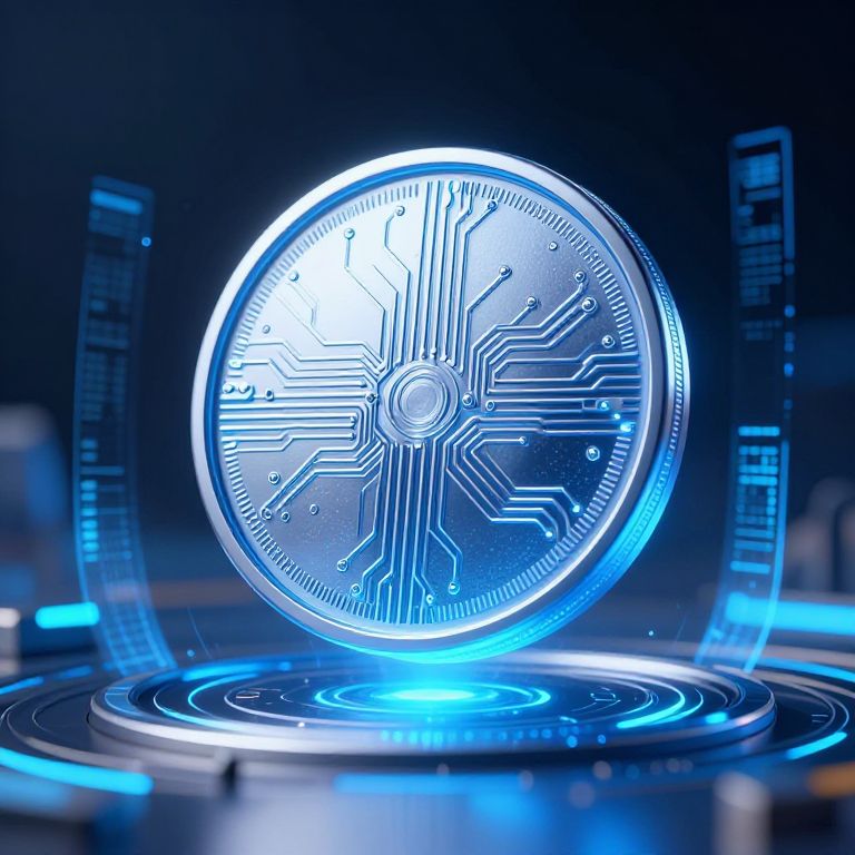A digital CGI image showcases a glowing, metallic coin with intricate, neon-blue circuit patterns on its surface, centered against a dark, futuristic background. The coin, illuminated by blue light, floats on a circular, glowing platform with concentric blue rings. Two vertical, translucent blue panels flank the coin, enhancing the high-tech aesthetic. The overall color palette consists of deep blues and metallic silvers, creating a sleek, sci-fi atmosphere. The coin's detailed circuit design adds a modern, technological feel to the image.