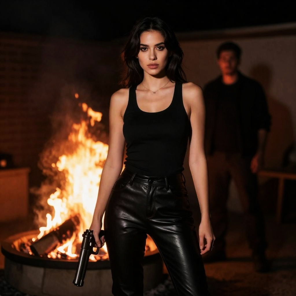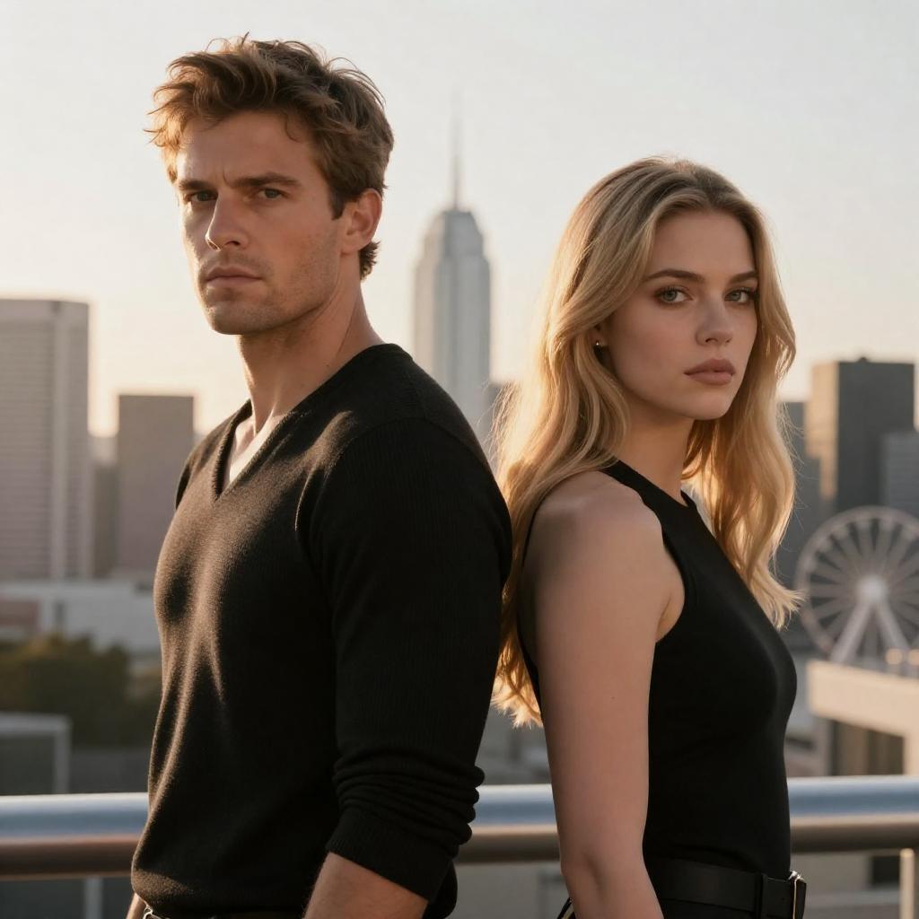 Photograph of a muscular man kneeling with a gun and a tall, slim woman standing on his back, both in black leather outfits. City skyline with sunset and Ferris wheel in background. Birds flying, clouds in sky. Woman has long blonde hair, man has short brown hair and beard. Woman looks back confidently, man looks forward intensely.