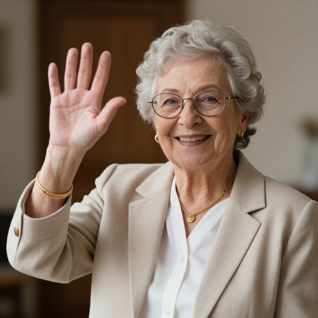 Photograph of an elderly woman with short, curly gray hair and wearing round glasses, smiling warmly while waving with her right hand. She is dressed in a beige blazer over a white blouse, accessorized with a gold necklace and bracelet. Her skin is fair with visible wrinkles, indicating age. The background is blurred, featuring indistinct brown and white elements, suggesting an indoor setting. The image has a professional quality, capturing a moment of friendly greeting.