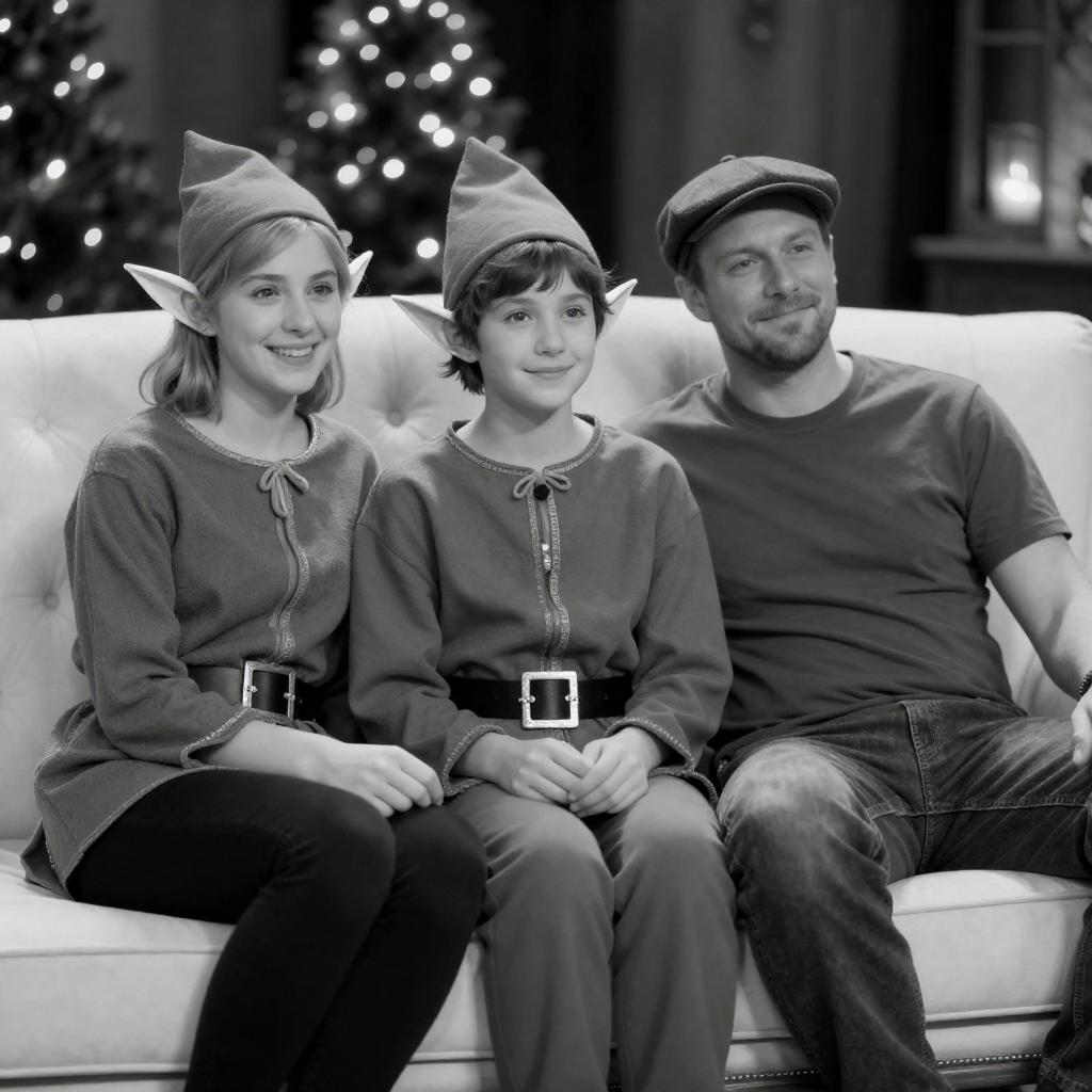 Black and White Portrait of Two Elves and Man on Couch
