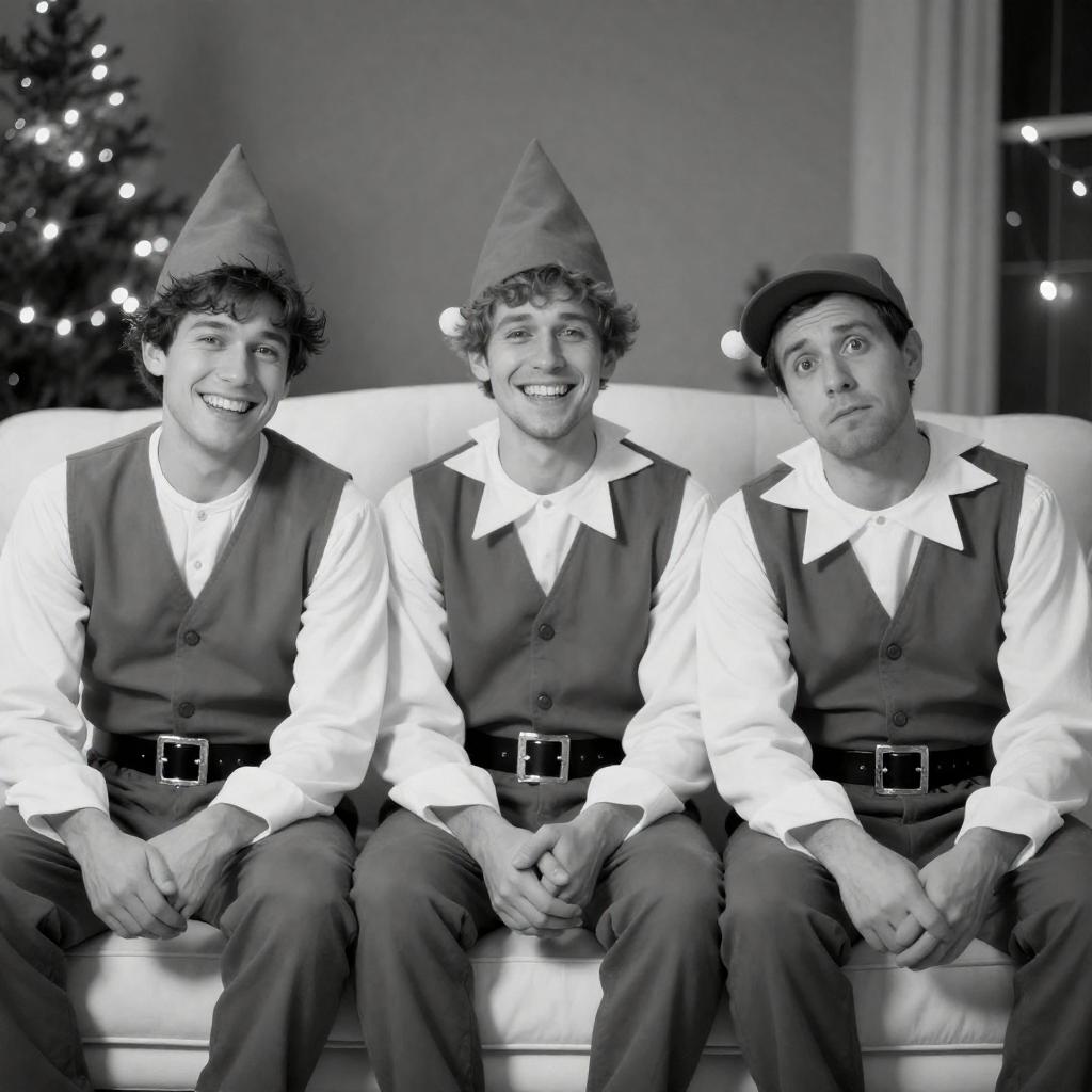 Black-and-white photograph of three people: two elves with pointed ears, wearing traditional elf costumes with hats, and a man in a casual shirt and cap, sitting on a white, tufted couch. The elves are smiling, while the man looks relaxed. Background features blurred, festive lights.