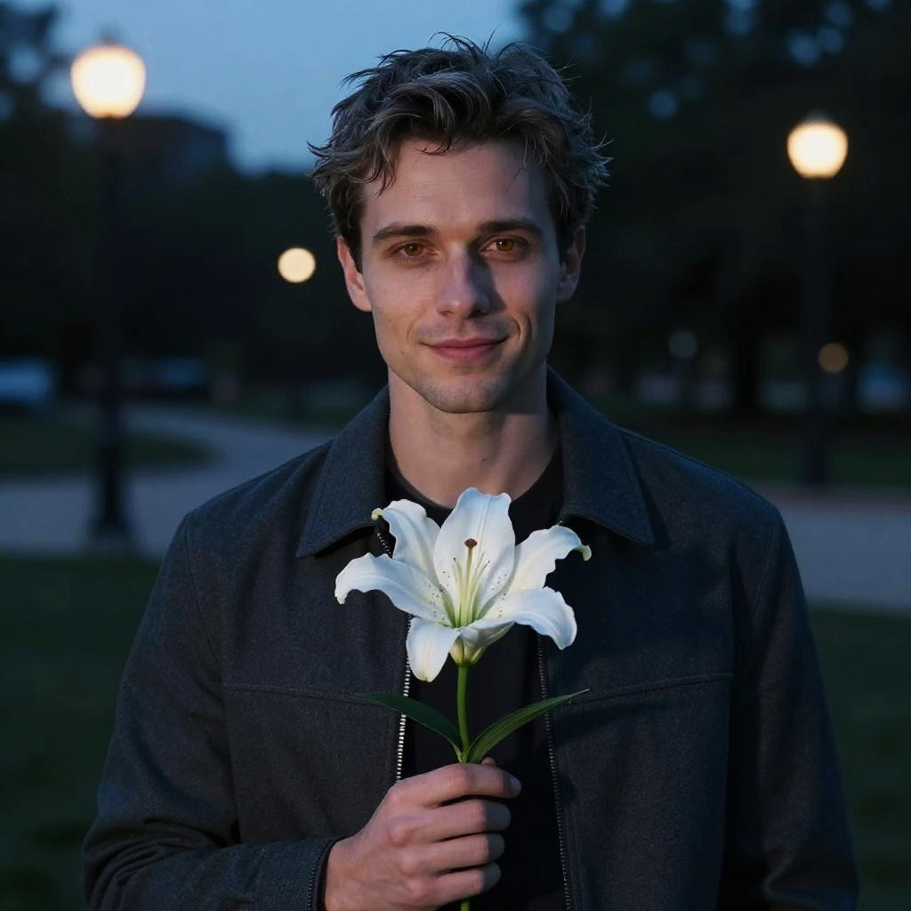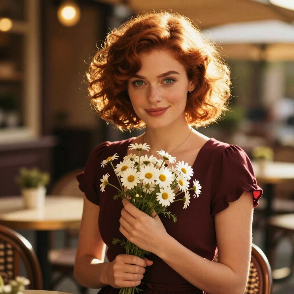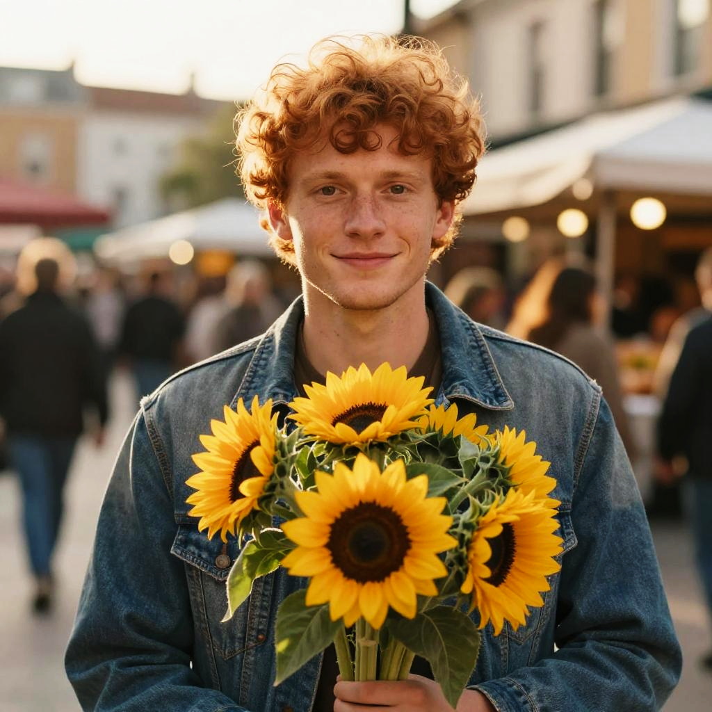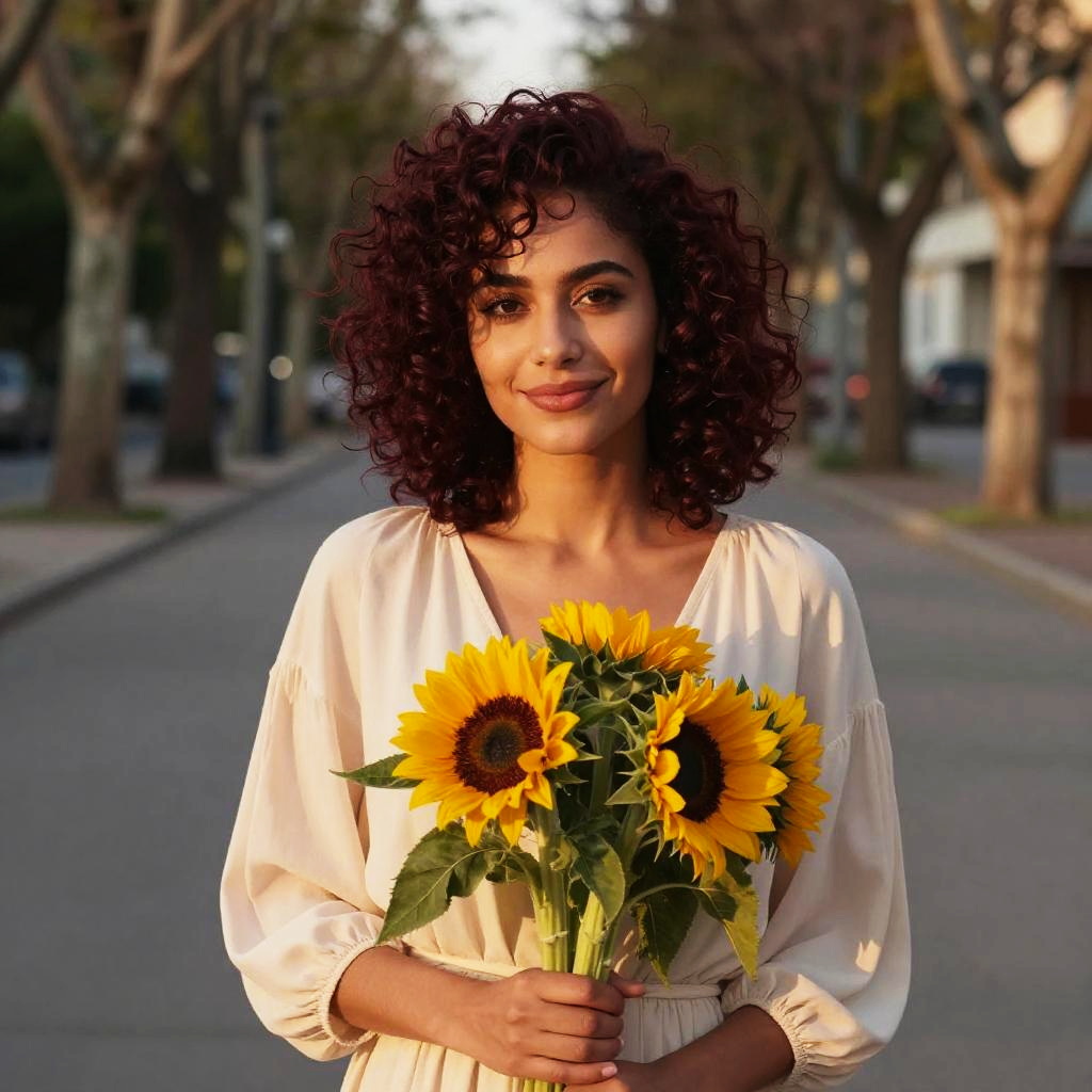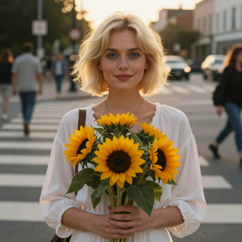 Artistic cinematic portrait of woman with platinum blonde bob haircut and bright blue eyes in busy crosswalk during golden hour, wearing a flowing white blouse, cradling a bouquet of bright sunflowers against her chest, subtle serene smile, nostalgic yet vibrant mood, warm backlight and soft focus, muted earth tones that make the sunflowers pop, gentle color grading, natural skin texture, clean composition, high detail, photorealistic finish.