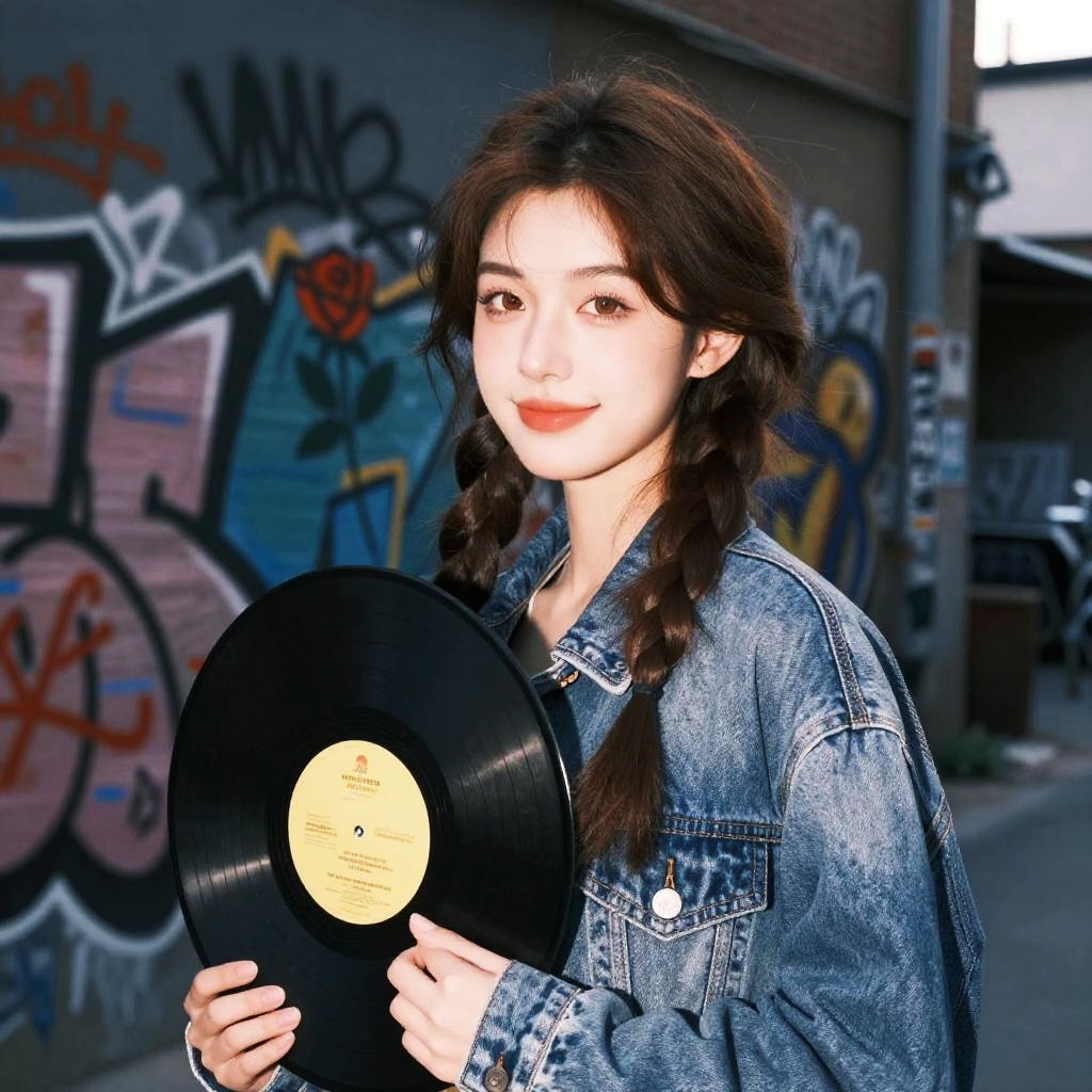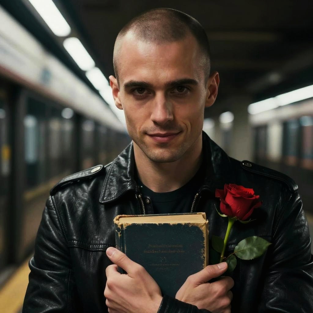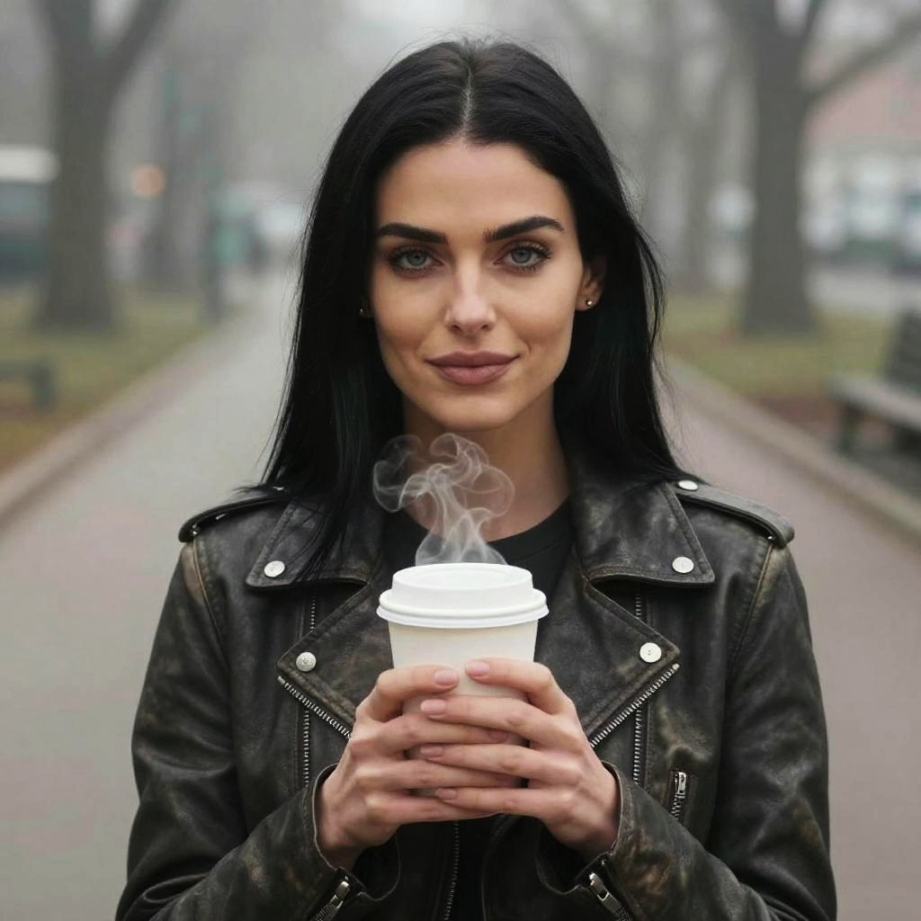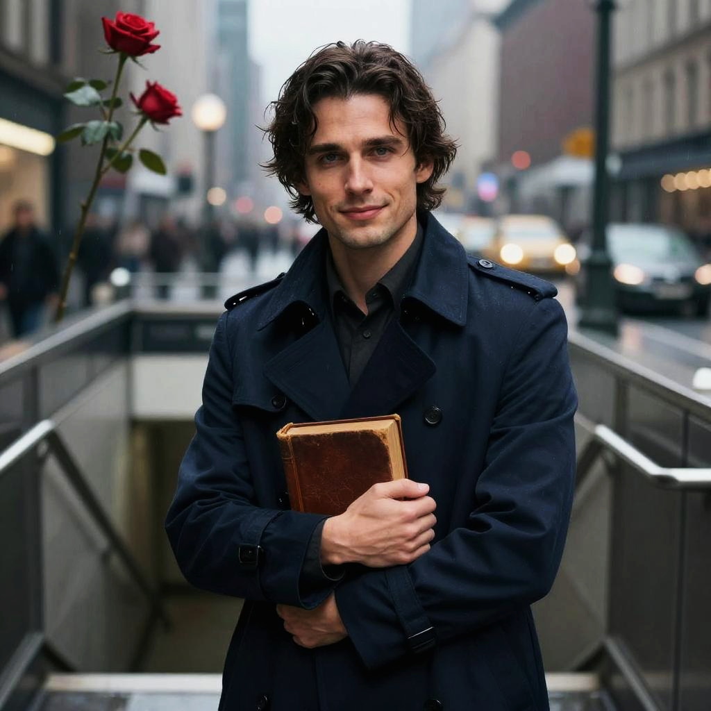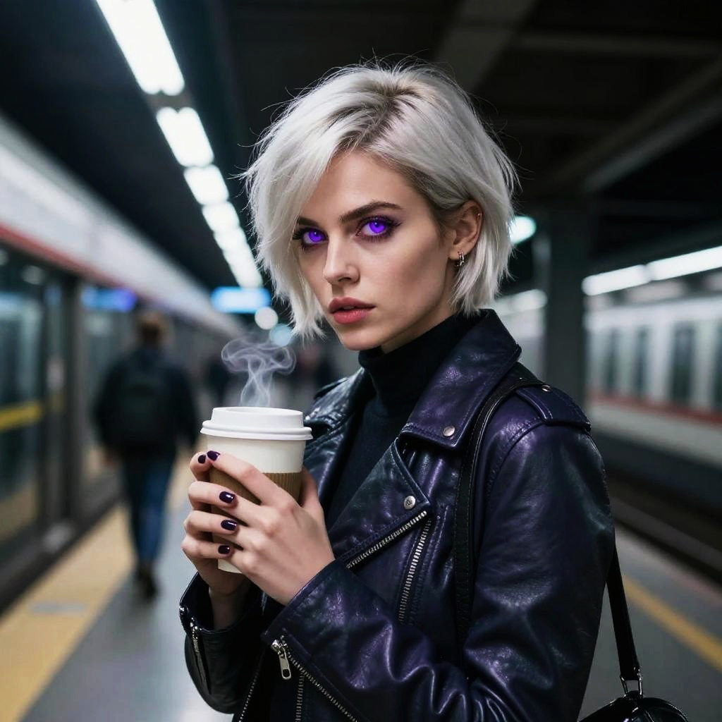 Artistic cinematic portrait of woman with platinum blonde bob haircut and bright blue eyes in busy crosswalk during golden hour, wearing a flowing white blouse, cradling a bouquet of bright sunflowers against her chest, subtle serene smile, nostalgic yet vibrant mood, warm backlight and soft focus, muted earth tones that make the sunflowers pop, gentle color grading, natural skin texture, clean composition, high detail, photorealistic finish.