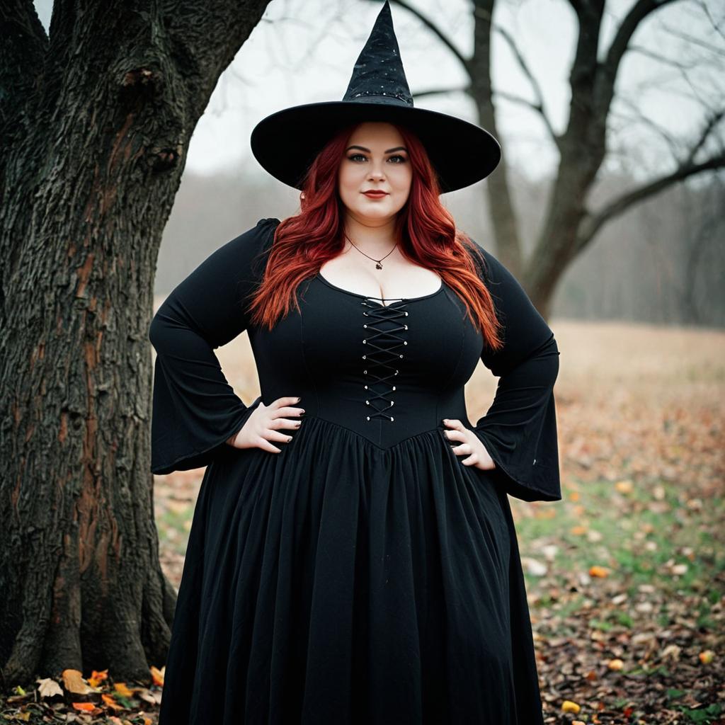 Plus size witch halloween,1girl, red hair, witch hat, solo, dress, hat, long hair, hand on own hip, black dress, witch, tree, outdoors, standing, black headwear, blurry background
