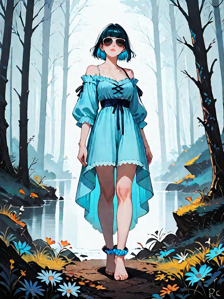 Illustration of a young woman with short blue hair wearing a vibrant turquoise boho sundress with a plunging neckline, delicate embroidery, tiered ruffle hem, and off-the-shoulder sleeves. She accessorizes with oversized sunglasses and a beaded anklet. She is barefoot, standing in a dark fantasy forest surrounded by fog and mist, with an ominous atmosphere. The scene is illuminated by torchlight, creating a medieval dark forest ambiance.