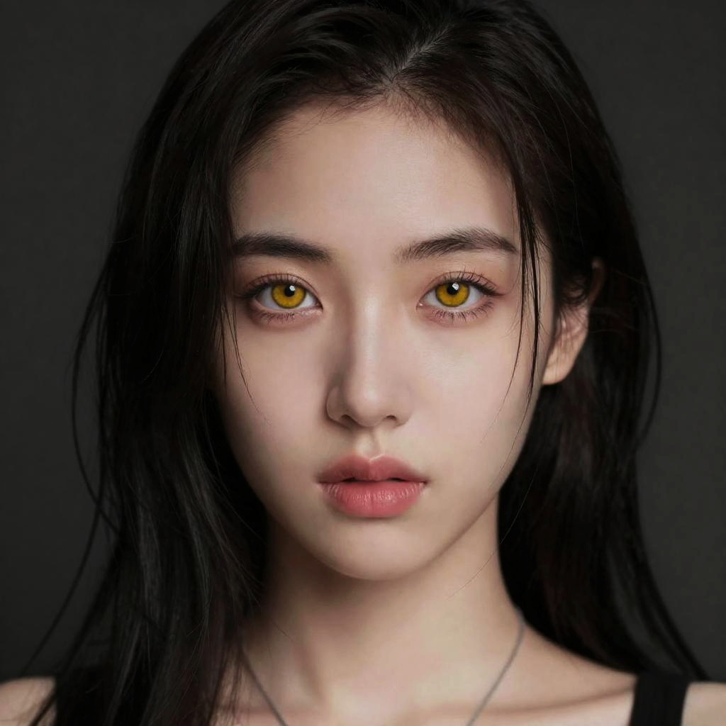 Close-up photograph of a young woman with wet, dark brown hair, yellow eyes, and pink lips. She gazes directly forward with a neutral expression. Dark background, slightly blurred. Her skin is pale. She wears a silver necklace.