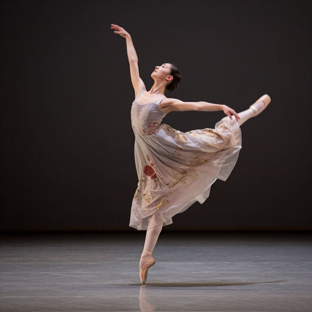 Muscular lesbian dancer performing a powerful ballet pose on stage, spotlight illuminating her sculpted muscles and graceful form, elegant costume with flowing fabric, rich colors and dynamic movement captured in digital painting style