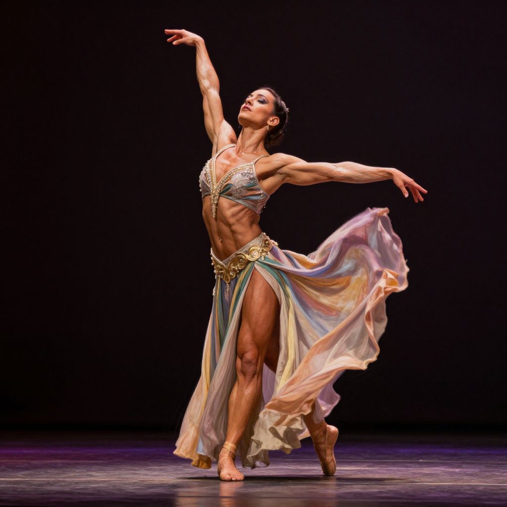 Photograph of a muscular female dancer performing on stage against a black background. She has a tan complexion, dark hair in a bun, and is wearing a shimmering, iridescent, sleeveless top and a flowing, pastel-colored skirt with gold accents. Her toned arms and legs are extended gracefully, with one arm raised above her head and the other out to the side. Her skirt billows dramatically with movement. She is barefoot, standing on a dark, polished stage floor. The lighting highlights her defined muscles and the shimmer of her costume, creating a dynamic and elegant visual effect.