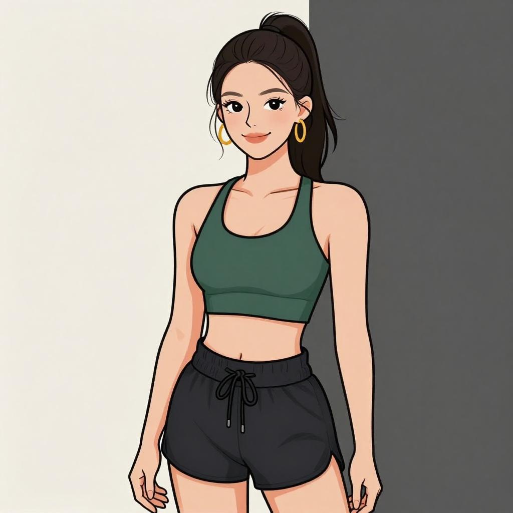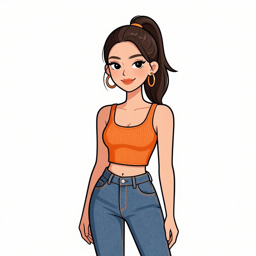 Woman with pretty face and pretty hair. smiling Woman, streetwear, red and white racerback tank top with prominent front zipper, silver hoop earrings, high-waisted camouflage cargo pants, chain accessory, white lettering detail on waistband, studio background --sref 1467