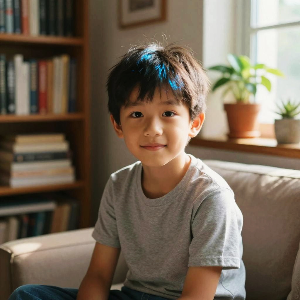 Asian boy with short brown hair wearing a white chef's hat and a red apron.