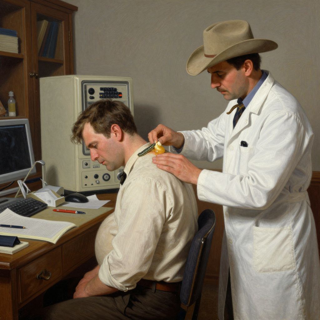Gentleman being examined by snakelike cowboy physician doctor extracting build up of bearish bile from the mans hyper inflated top buyers neck, digital painting by otto dix on 35mm film, 8k 1080p