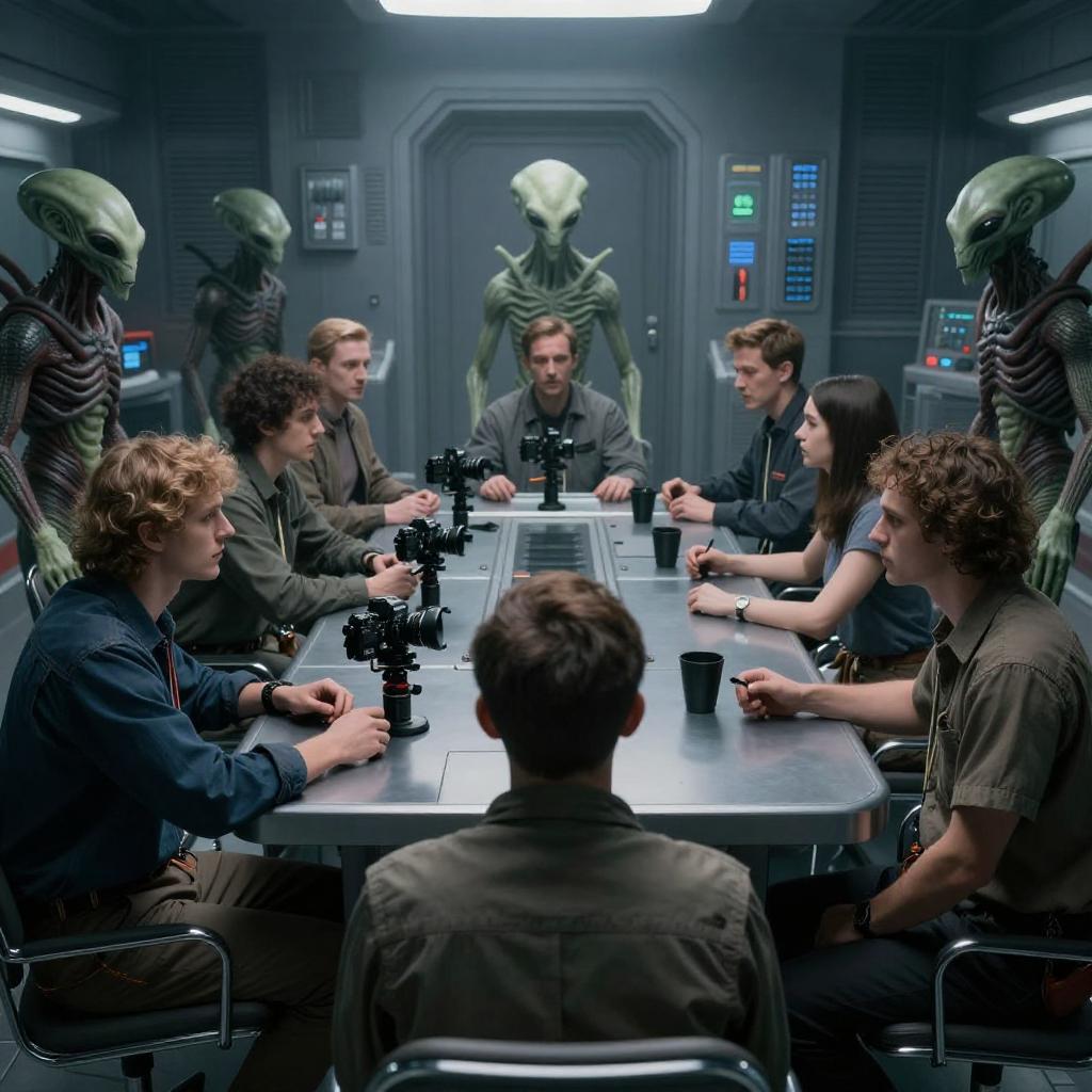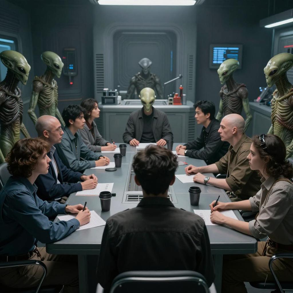 Syberart Create a tense and dramatic screenshot of a group of people being interrogated by an alien species, set in the year 2980. Use advanced lighting techniques to capture the mood and atmosphere of the scene, and incorporate elements of the interrogation room, such as harsh lighting and sterile surroundings, to add tension and fear. Utilize a 35mm camera and anamorphic lens to give the image a classic and cinematic feel, and use post-processing software like Lightroom to sharpen and enhance the details of the image. Use a professional camera brand like ARRI, Canon, Fuji, or Kodak to ensure impeccable image quality and realism.
