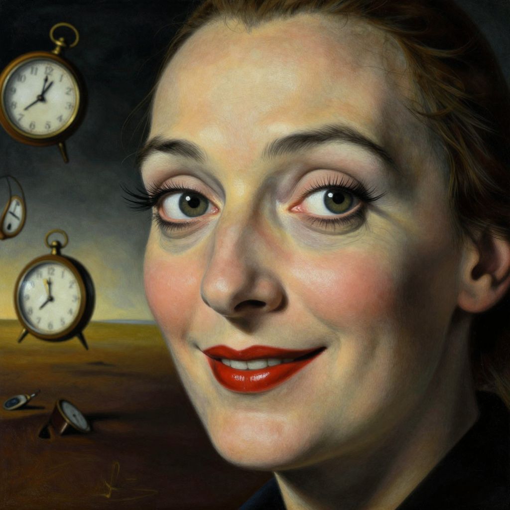Digital painting of a smiling woman with red lipstick, green eyes, and freckled face, surrounded by floating clocks against a dark, abstract background.