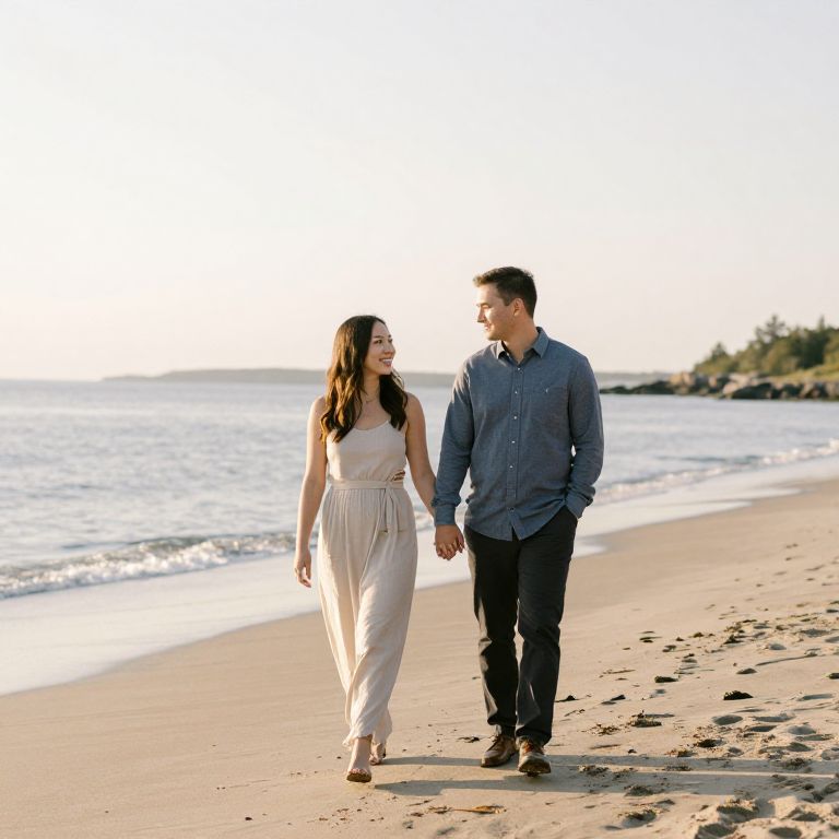 Couple walking hand-in-hand along a serene Maine beach during a golden-hour engagement session, captured by Stepheney Collins Photography.