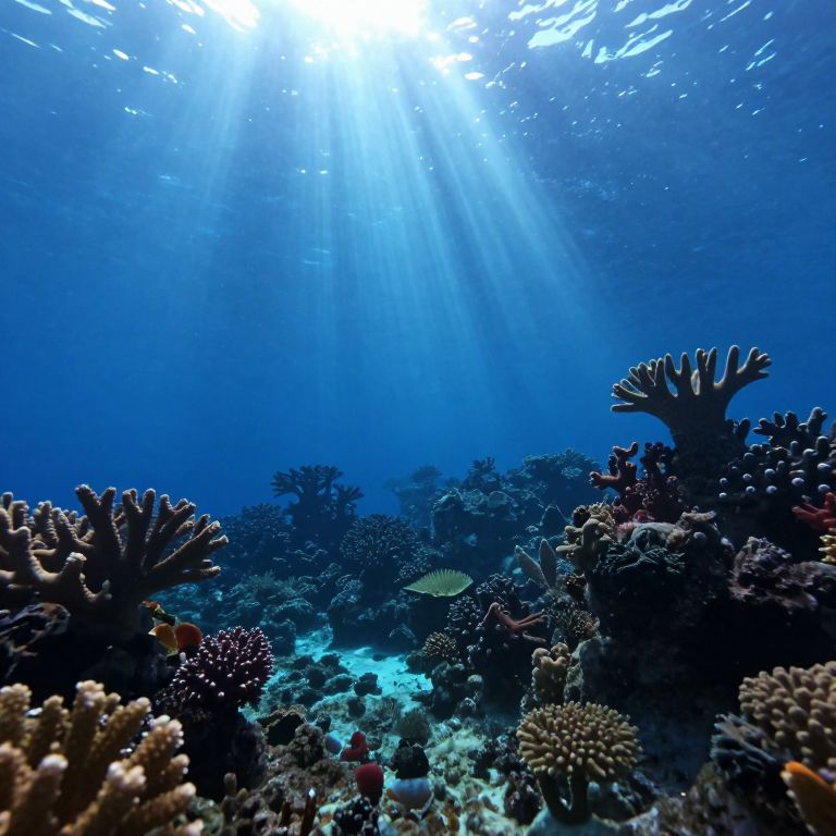 A mesmerizing underwater scene rendered in high-definition 3D, showcasing dramatic light effects piercing through the deep blue waters, surrounded by textured coral formations, evoking the serene beauty of marine life.