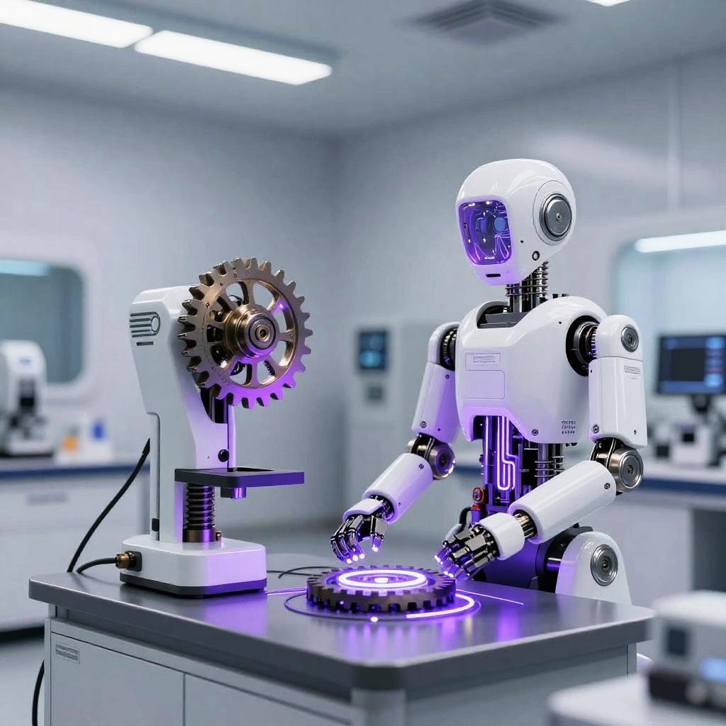 Futuristic machines with intricate gears and glowing circuits, operating in a sterile high-tech laboratory, illuminated by soft white and purple lighting, showcasing advanced AI technology, ultra-realistic style