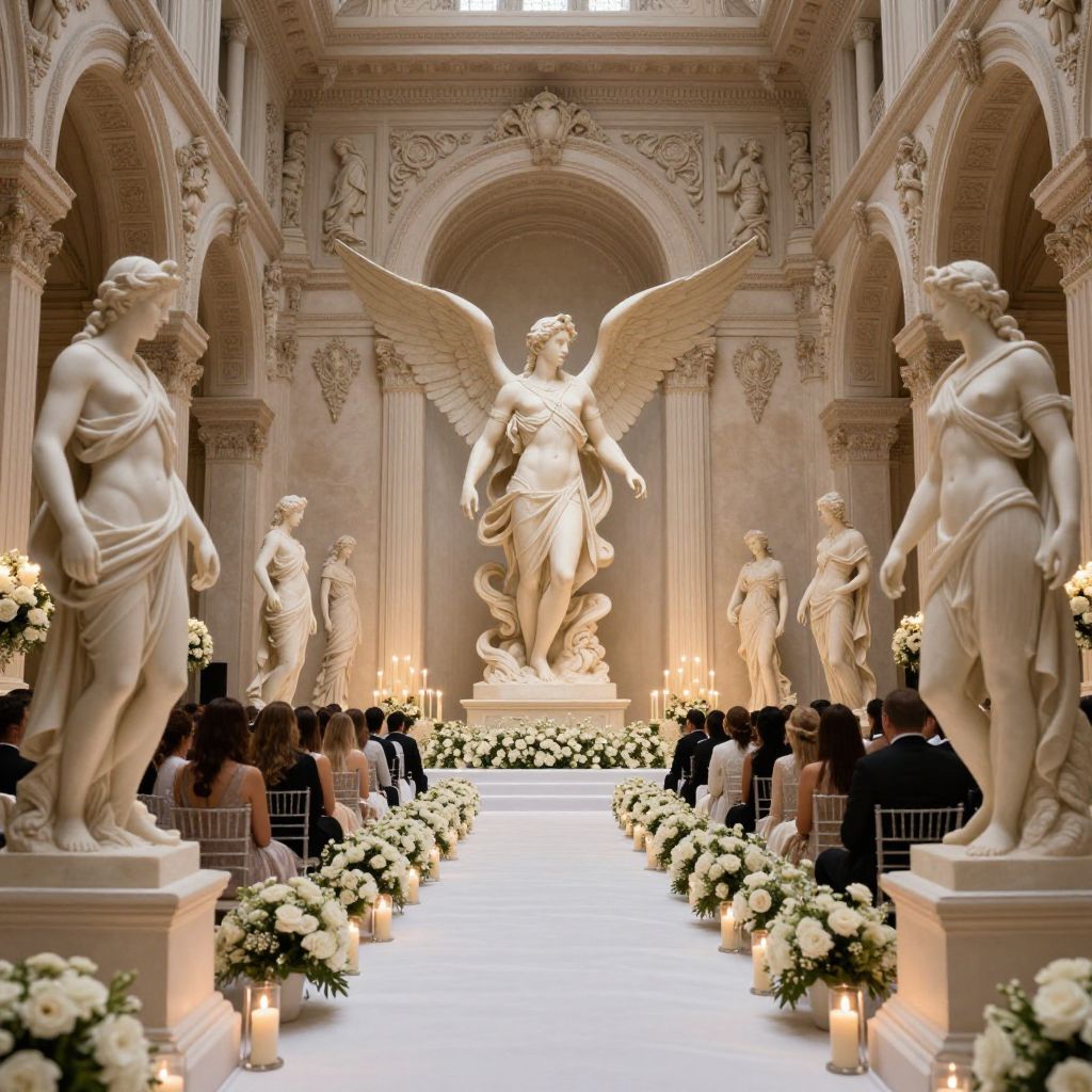 The image depicts a luxurious and opulent wedding reception, reminiscent of Michelangelo sculptures surrounded by guests along the aisle, as seen in the Blade Runner movie. The scene is set in a grand, architecturally impressive hall with high ceilings adorned with intricate carvings and statues. The central focus is a large, detailed sculpture of a winged figure, possibly a representation of a mythological being, positioned at the end of a long, white aisle lined with candles and white flowers. The aisle is flanked by statues of classical figures, each meticulously crafted with attention to detail, standing on either side of the path. The lighting is soft and warm, casting a gentle glow on the sculptures and creating a serene atmosphere. The overall composition is symmetrical, with the sculptures and guests arranged in a balanced manner, enhancing the grandeur and elegance of the setting.