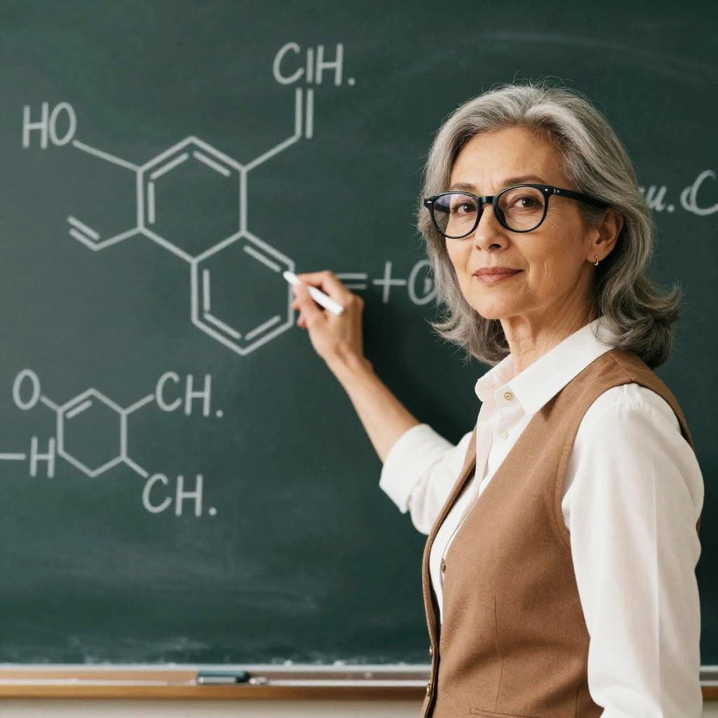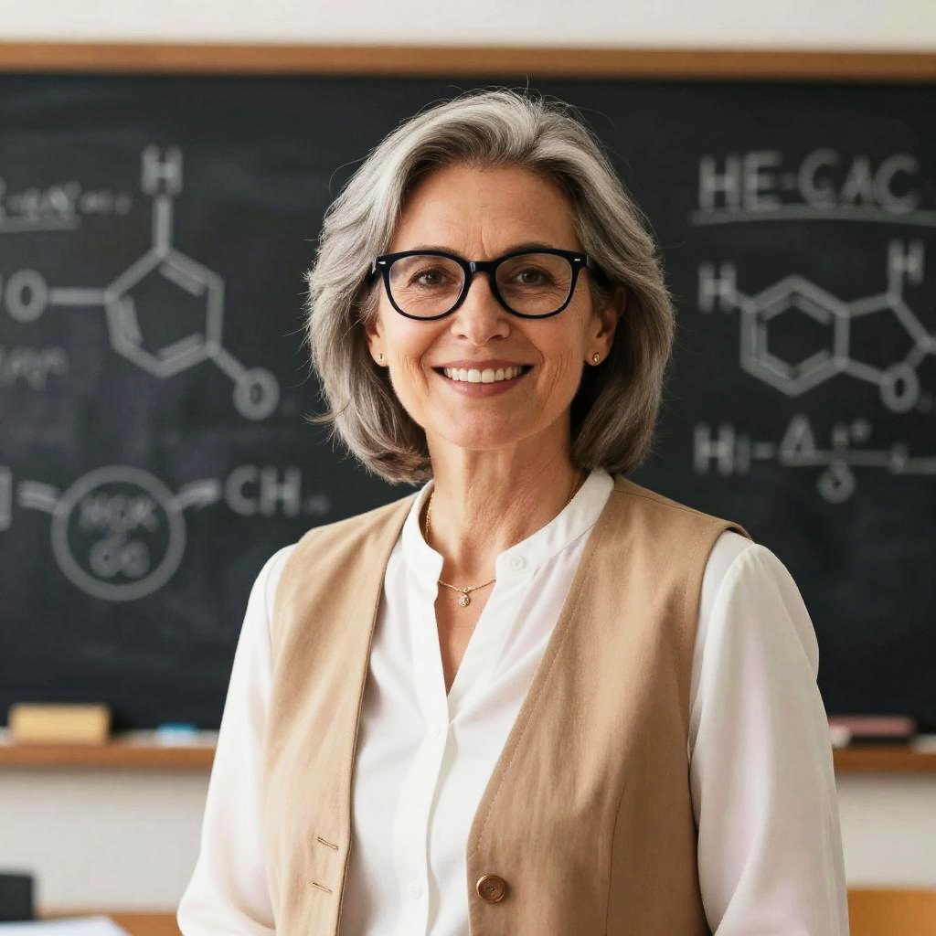 A middle-aged woman with grey hair and black glasses, wearing a white blouse and a brown vest, standing in front of a chalkboard with chemical formulas written on it, classroom setting, warm natural light, realistic skin texture, soft focus background