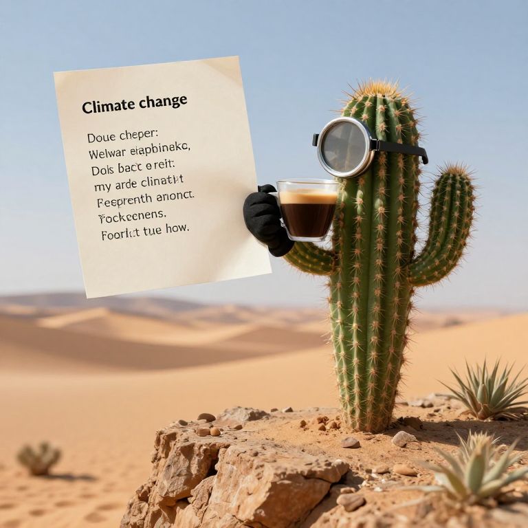 A sentient cactus, wearing a monocle and gloved hand, leisurely sips espresso and composes poetry about climate change on a desert cliff.