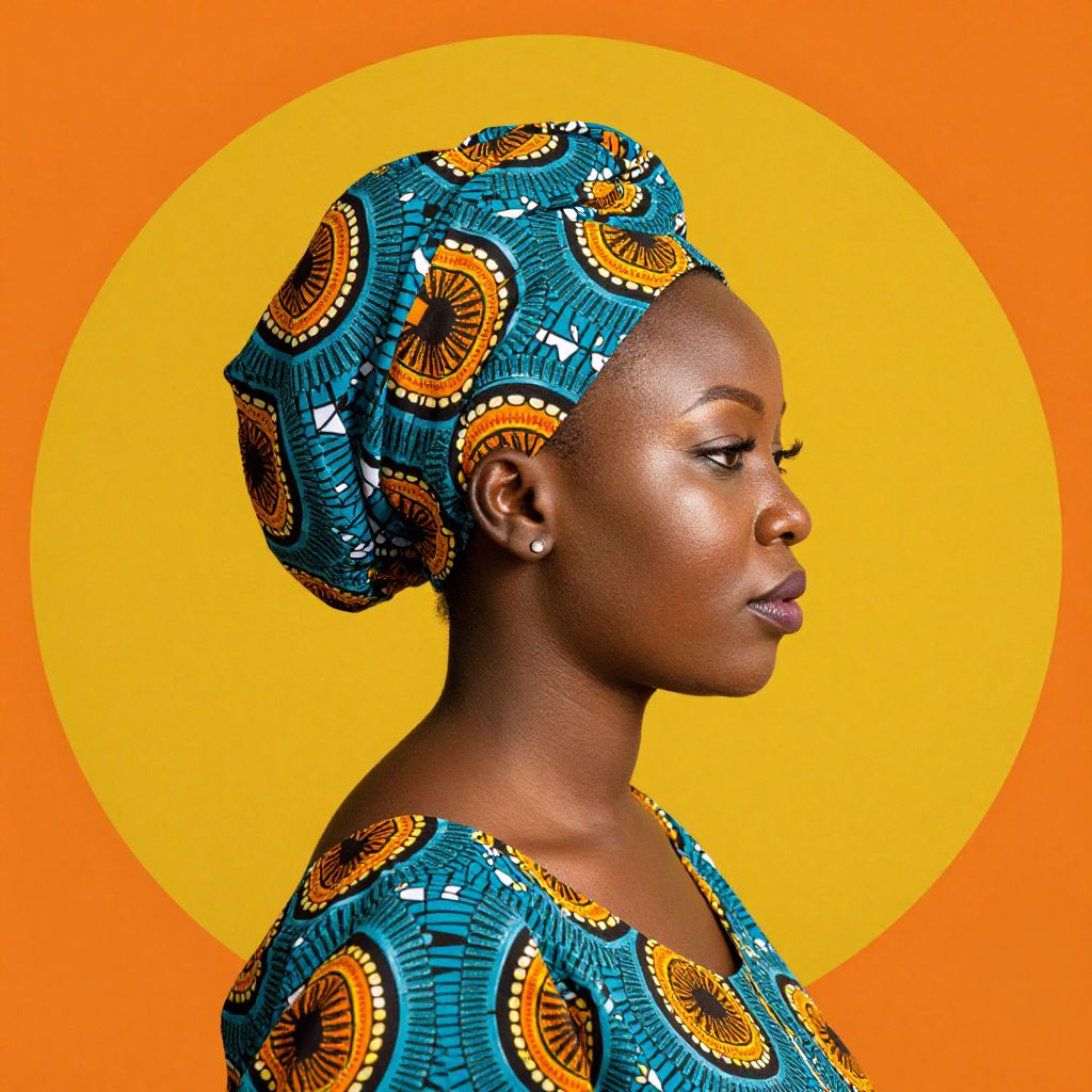 Profile portrait of an African woman wearing a vibrant, intricately patterned headwrap and matching attire, set against a bold circular background of orange, yellow, and teal hues.