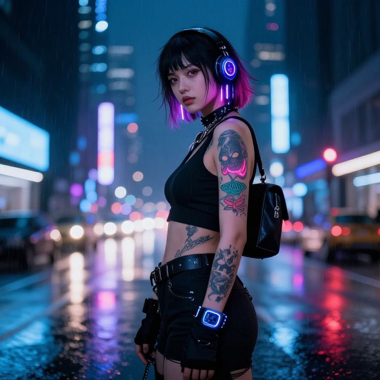 Photograph of a young Asian woman with short, black and pink-dyed hair, wearing purple headphones, a black crop top, and black shorts with fingerless gloves and a black purse. She has multiple colorful tattoos on her left arm, including a pink skull and blue butterfly. She stands in a neon-lit, rain-soaked urban street at night, with blurred, colorful lights from buildings and cars in the background. The wet street reflects the vibrant city lights. Her expression is serious, and she looks directly at the camera. The image has a cyberpunk aesthetic.