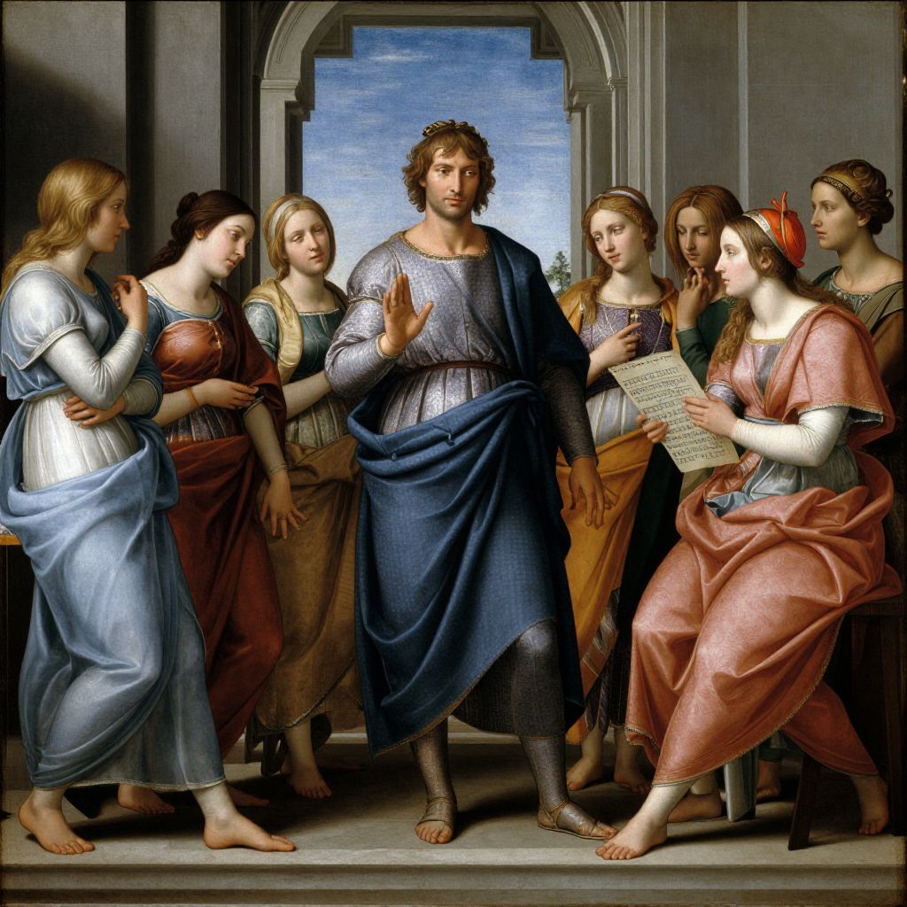 Pythagoras teaching a class of women, depicted by Raffaello Sanzio, with one woman holding a musical score.