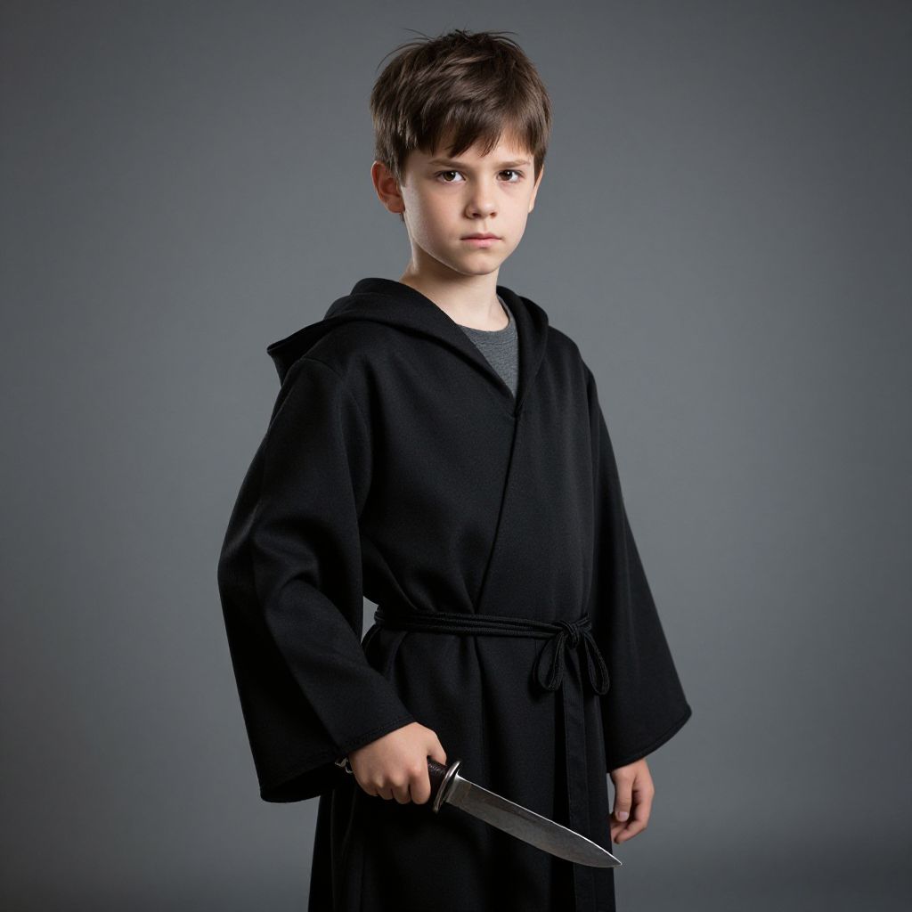 "Underworld Robe Kid, image of a young boy dressed in a robe and holding a knife"