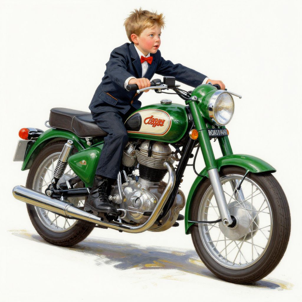 Wizard Normal Rockwell painting of a Royal Enfield Classic 350 1980 model, British racing green, vivd brushstrokes, white background, Norman Rockwell Style, small boy in awe,