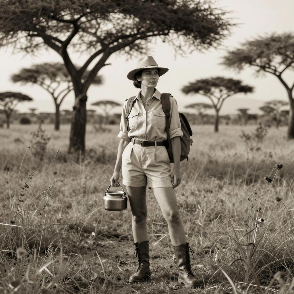 A sepia-toned photograph of a woman standing in a grassy savanna with acacia trees. She's wearing a beige safari outfit with a hat, shorts, and boots, and carrying a small metal pot in her right hand. She has a brown backpack and a confident expression. The sunlight filters through the trees, casting soft shadows on the ground.