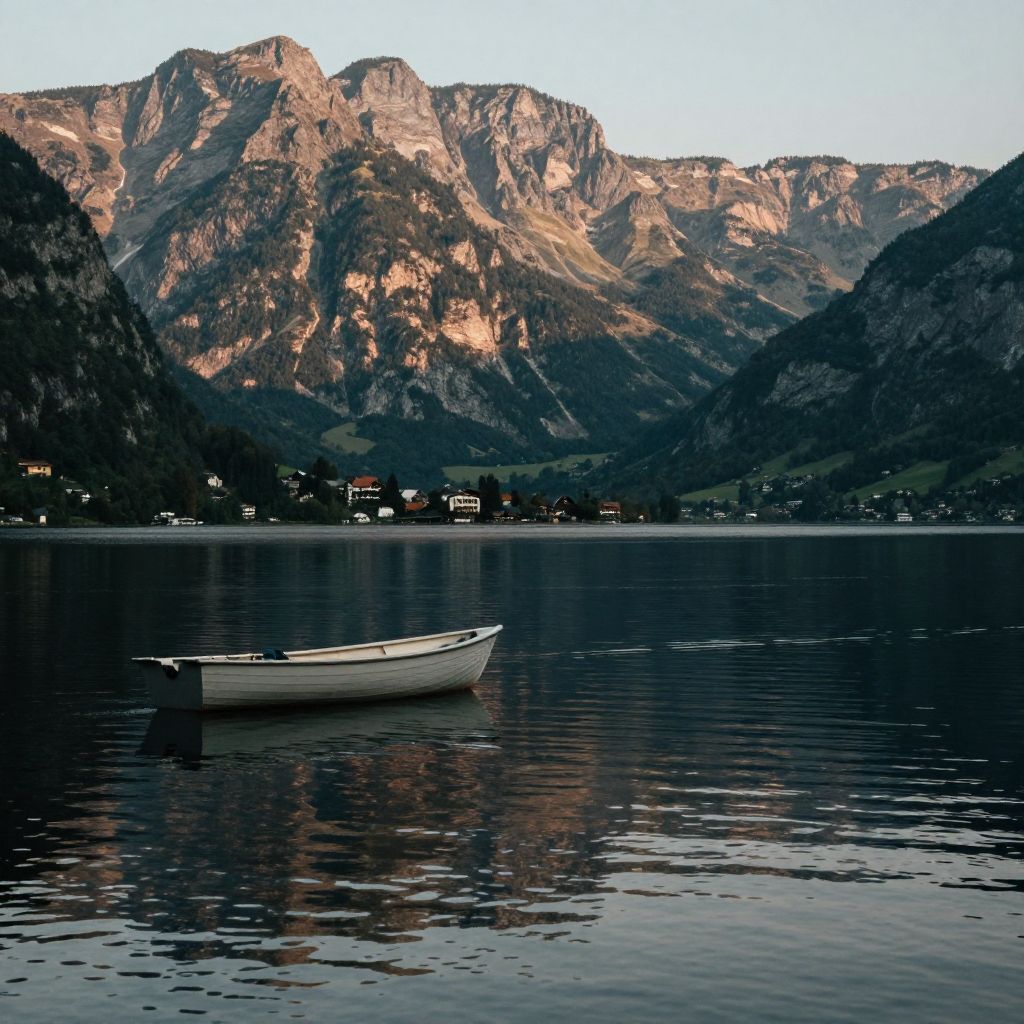 Photograph of a serene lake with a small, white wooden rowboat floating in the calm, reflective water in the foreground. In the background, towering, sunlit mountains with rugged textures and shadows create a dramatic backdrop. The mountains are bathed in warm, golden light, contrasting with the dark, forested slopes. A small village with scattered, white and red-roofed houses is nestled at the base of the mountains. The sky above is clear and blue, enhancing the peaceful, natural beauty of the scene.