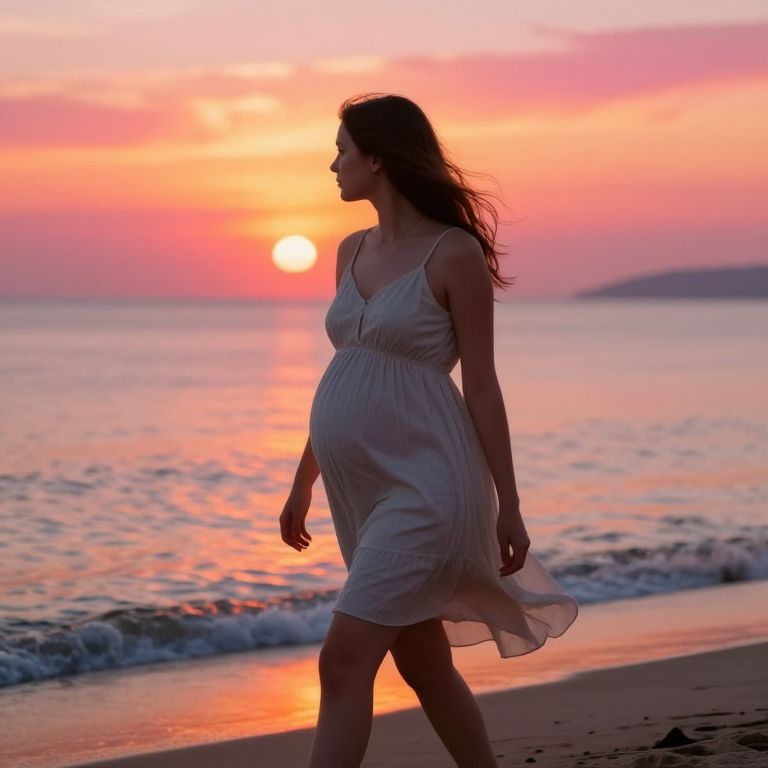Photograph of a pregnant woman with long, wavy brown hair walking on a beach at sunset. She wears a flowing, sleeveless white dress that gently billows in the breeze. The sun, a bright orange orb, is low on the horizon, casting a warm, pink and orange glow across the sky and reflecting on the calm ocean waves. The background includes a blurred shoreline and distant hills. The woman's silhouette is dark against the colorful sunset, emphasizing her profile and the gentle curve of her pregnant belly. The texture of the sand beneath her feet is slightly wet from the receding waves.