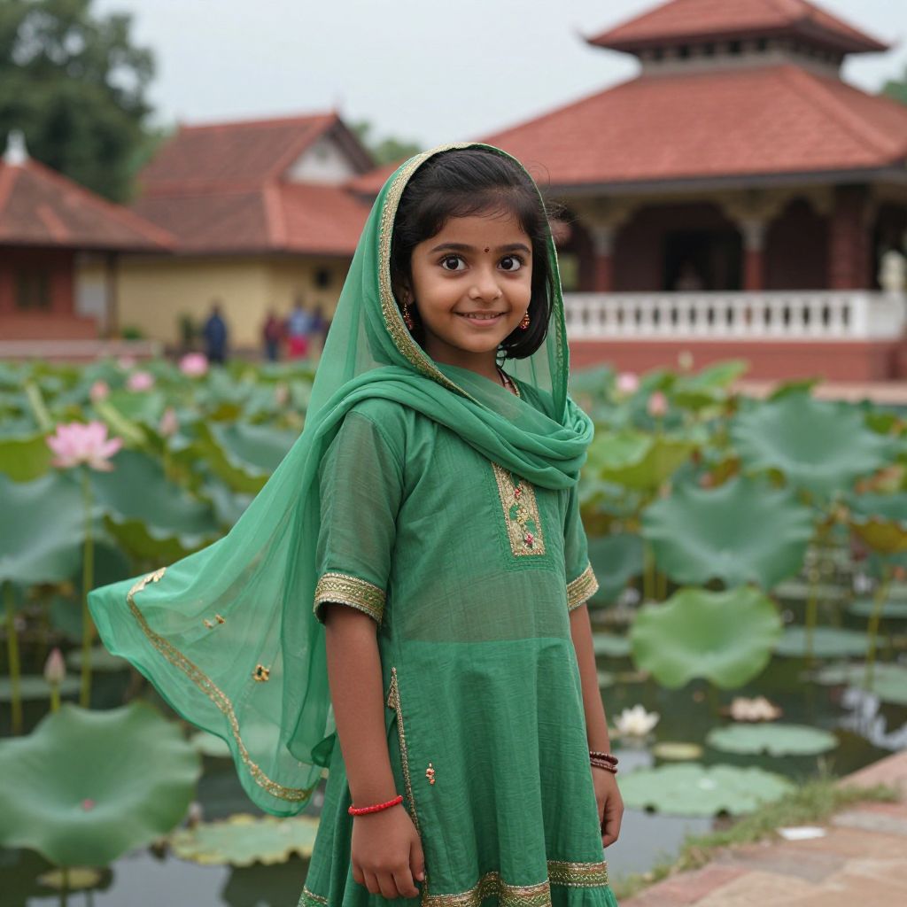 A young girl with large, expressive eyes and a cheerful smile wearing a traditional green gown dupatta costume, posing in front of a temple with peeping lotus ponds and red-tiled rooftops in a quiet village setting, the dupatta is gently fluttering in a light breeze, cinematic and natural lighting.