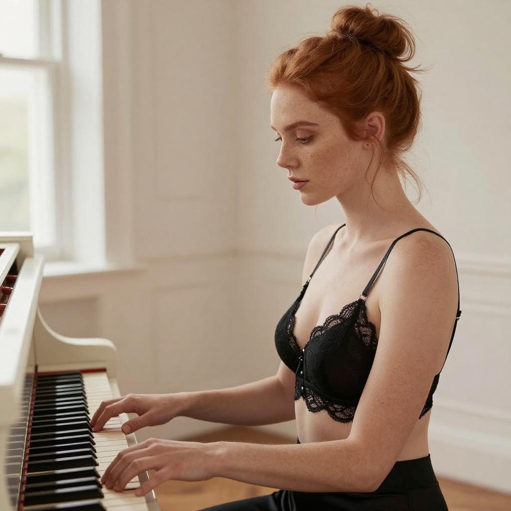 Intimate lifestyle portrait of a woman playing the piano, red-haired woman with messy bun and subtle freckles, seated at a white grand piano, wearing an elegant black balconette bra with delicate lace trim bra with delicate straps, shoulders turned three-quarters toward the viewer, focused expression as her fingers rest on the keys, soft natural light from a nearby window, creamy neutral background, high-end lingerie editorial photograph