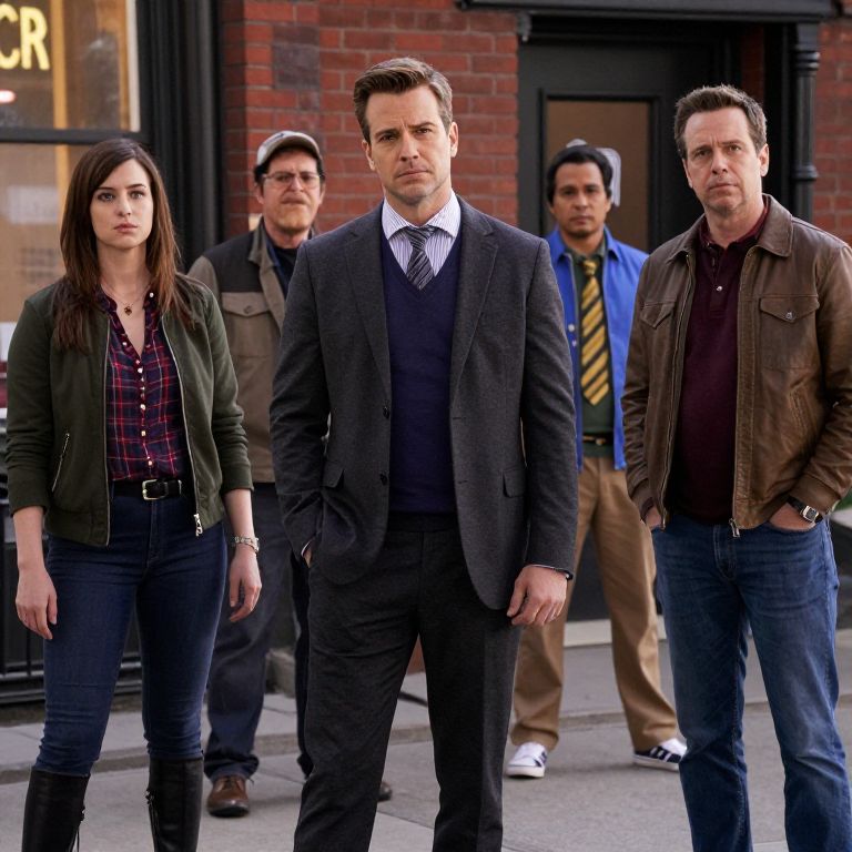 Photograph of a man with short brown hair and light stubble, dressed in a white lab coat over a light blue shirt, standing beside a white table. On the table is a black mortar and pestle with wooden sticks inside, a soap dispenser, and a smartphone. In the background, two people, a woman with long brown hair in a black jacket and a man in a dark jacket, stand observing. The setting is indoors with a plain white wall. The man in the lab coat looks focused, while the background individuals appear less engaged. The image has a slight digital enhancement effect.