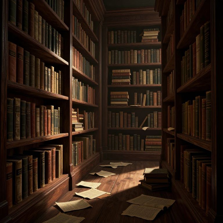 An atmospheric, vintage-style digital rendering of a dimly lit library aisle, where ancient wooden shelves overflow with weathered books, casting dramatic shadows as scattered pages lie strewn across the floor, evoking a sense of forgotten knowledge and silent stories waiting to be rediscovered.