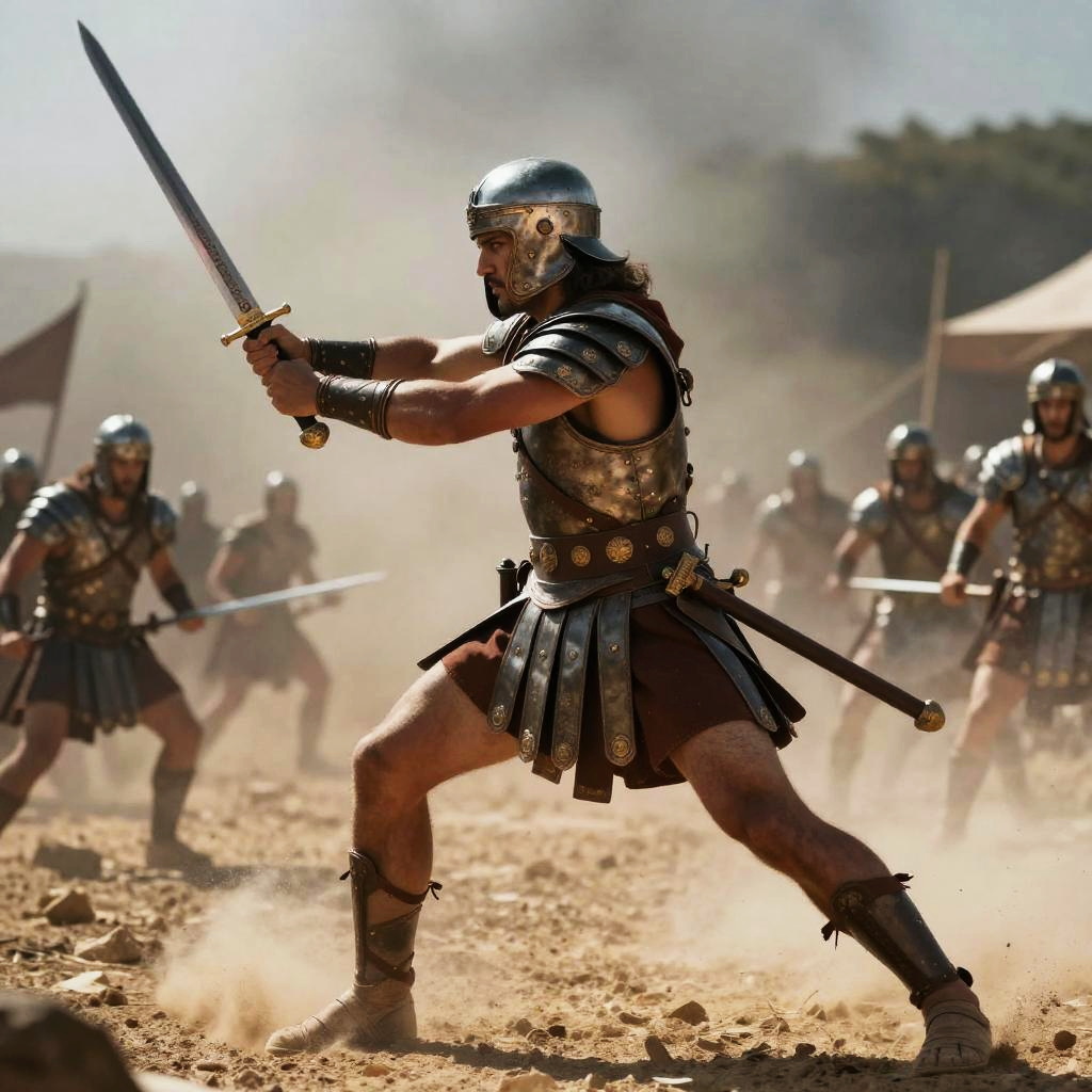 Greek long sword wielded by a warrior in classical armor, poised for battle on a dusty battlefield, dramatic lighting, dynamic action pose, cinematic style, rich textures